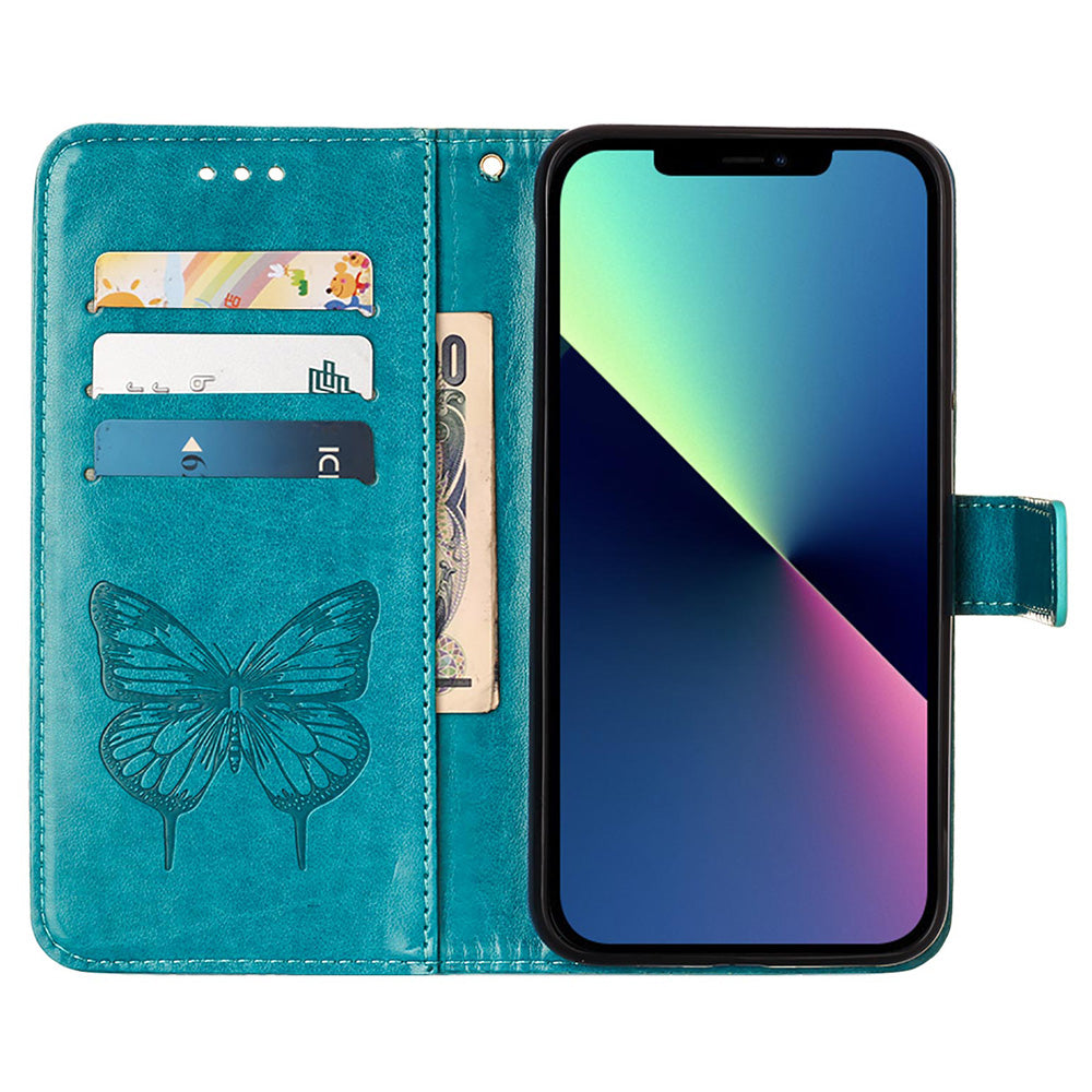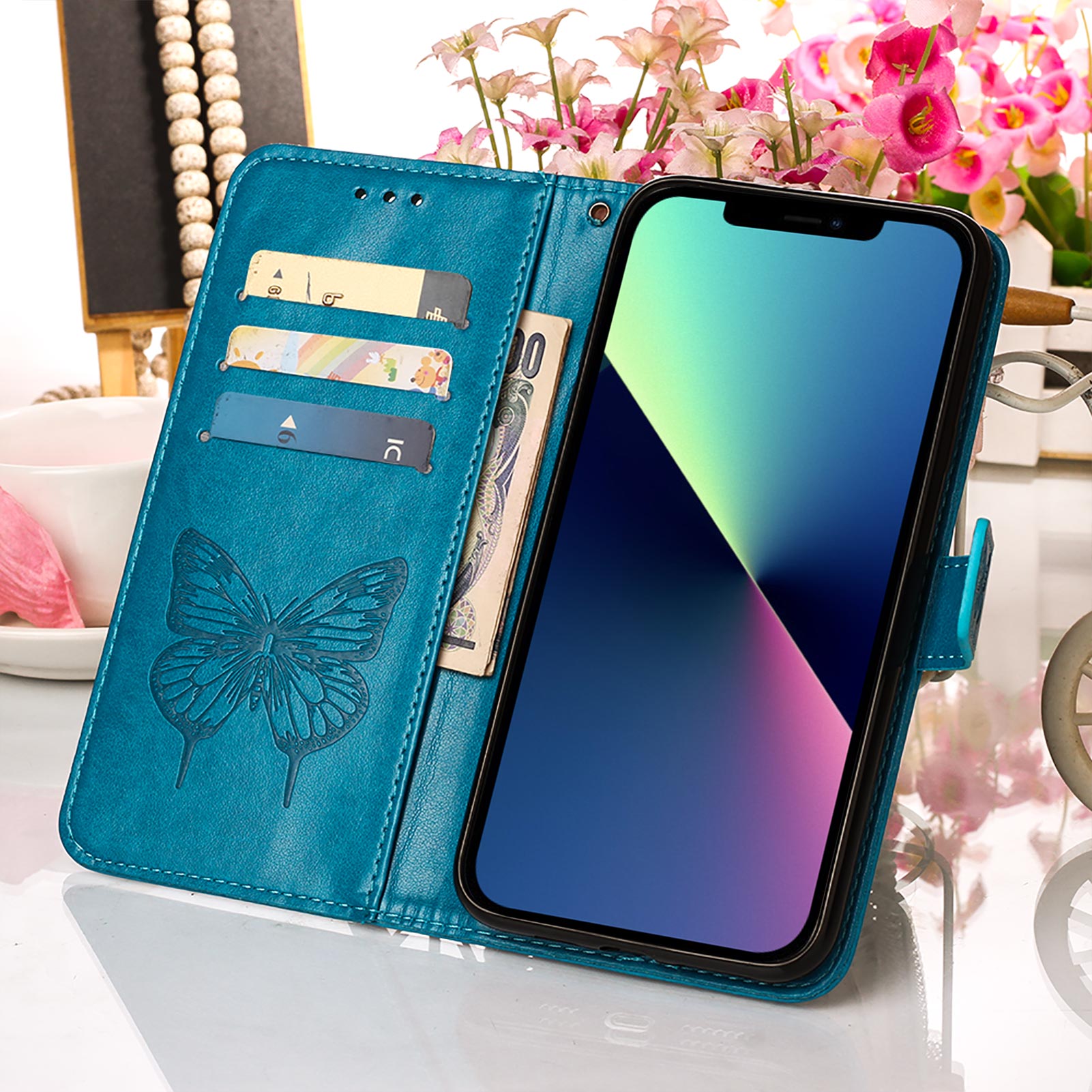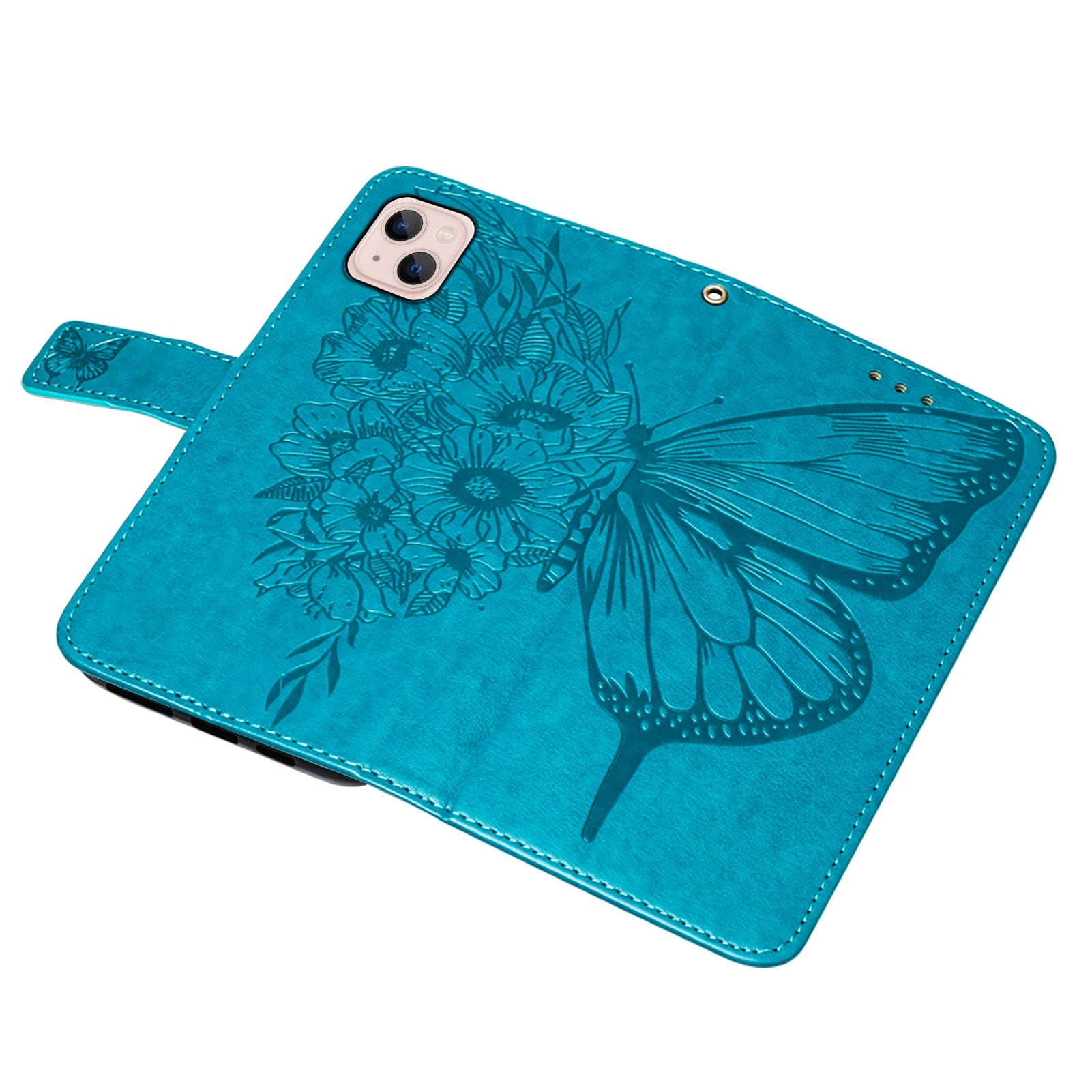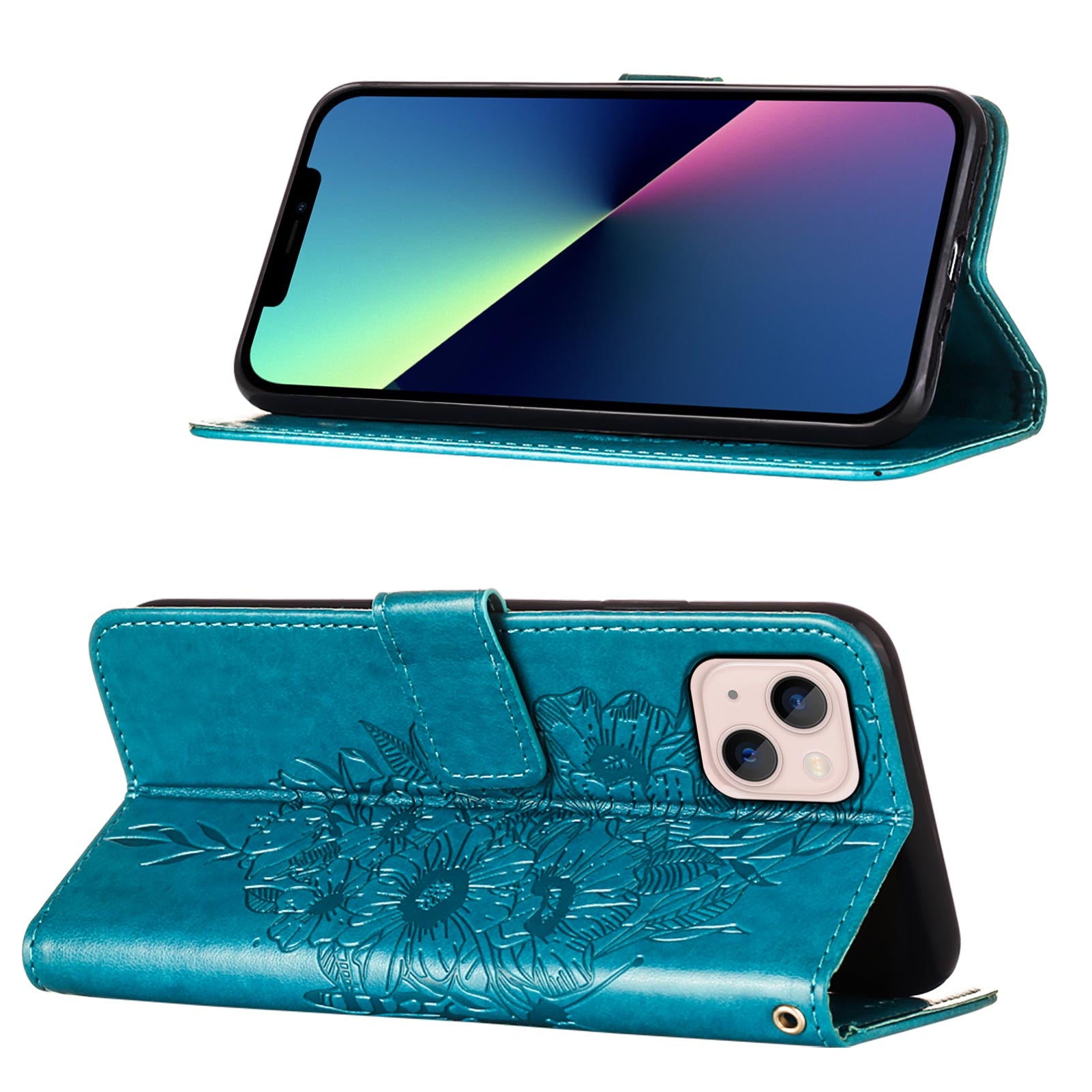 YB Imprinting Series-4 For iPhone 15 PU Leather Stand Phone Case Wallet Butterfly Flower Imprinted Cover with Hand Strap - Blue