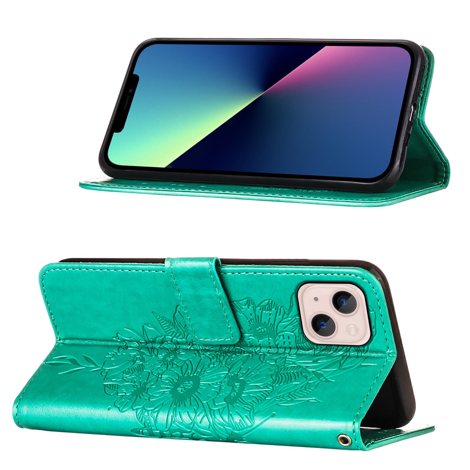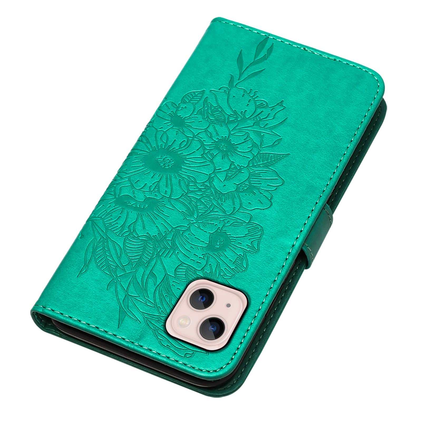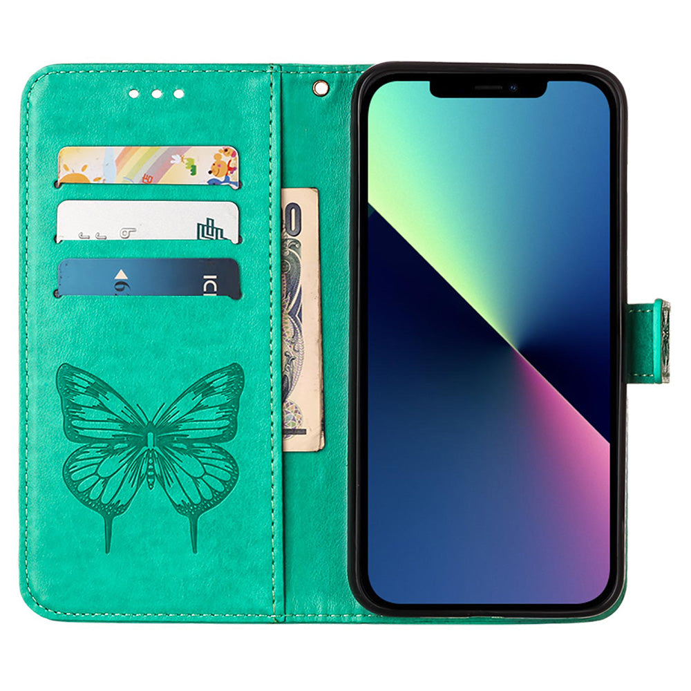 YB Imprinting Series-4 For iPhone 15 PU Leather Stand Phone Case Wallet Butterfly Flower Imprinted Cover with Hand Strap - Green
