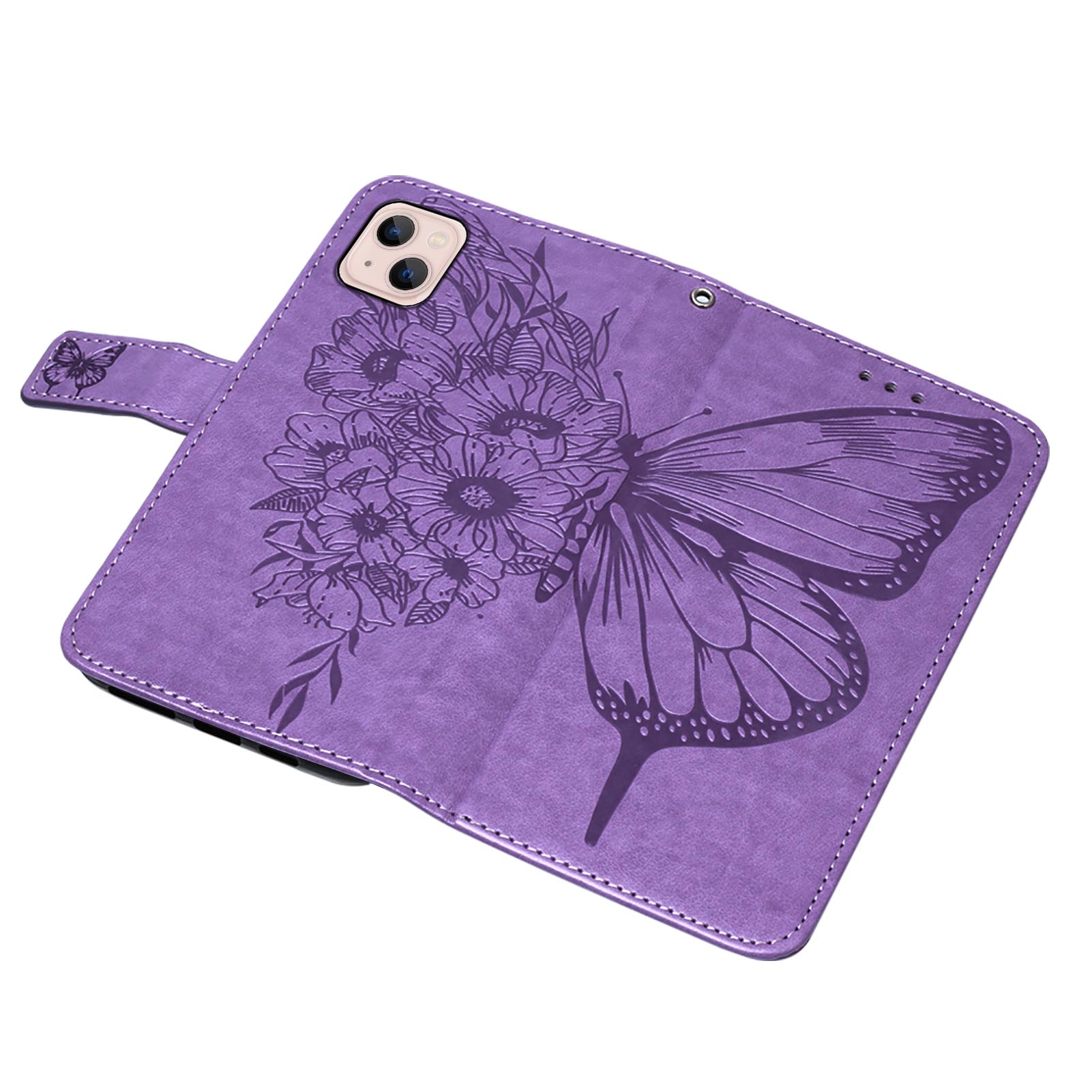 YB Imprinting Series-4 For iPhone 15 PU Leather Stand Phone Case Wallet Butterfly Flower Imprinted Cover with Hand Strap - Light Purple