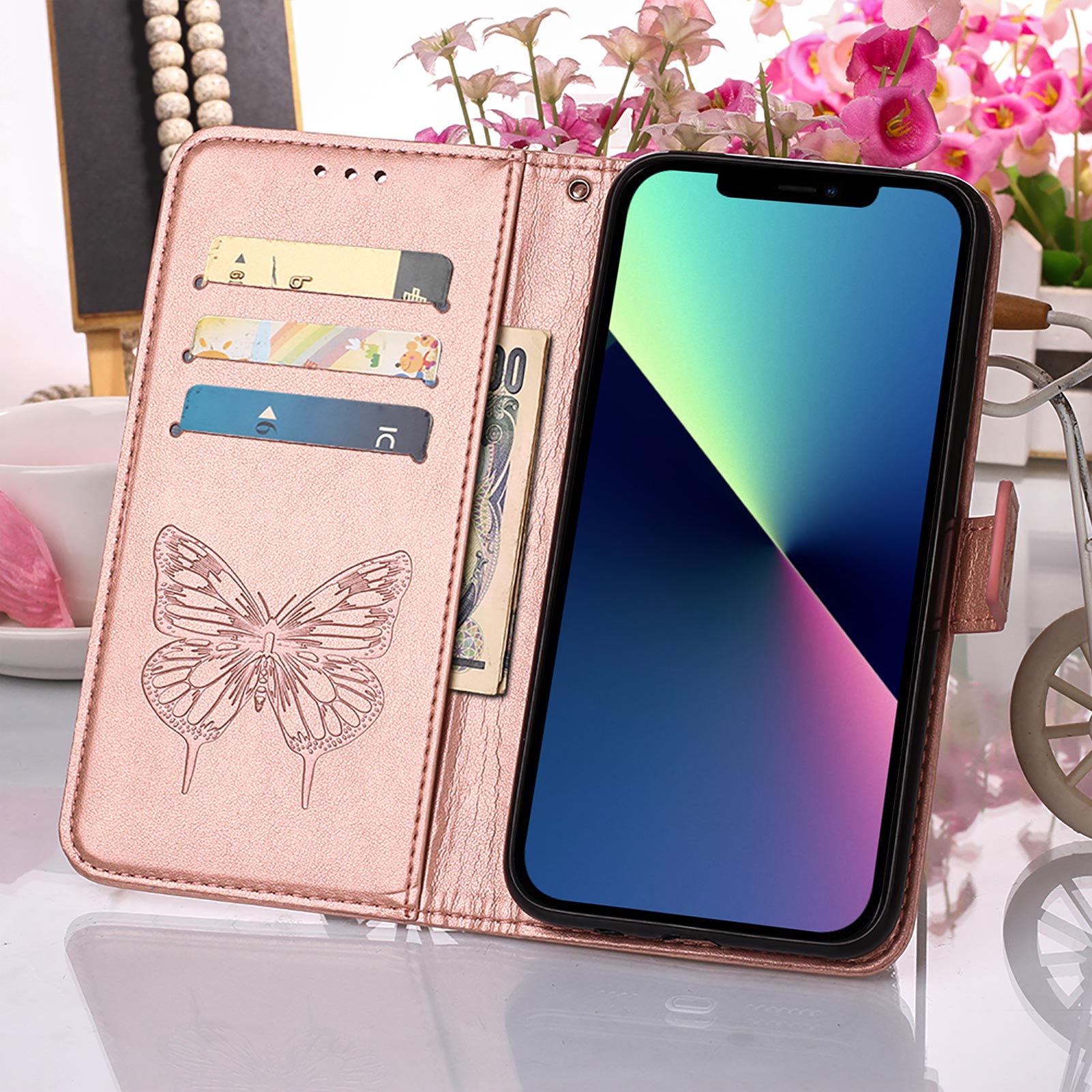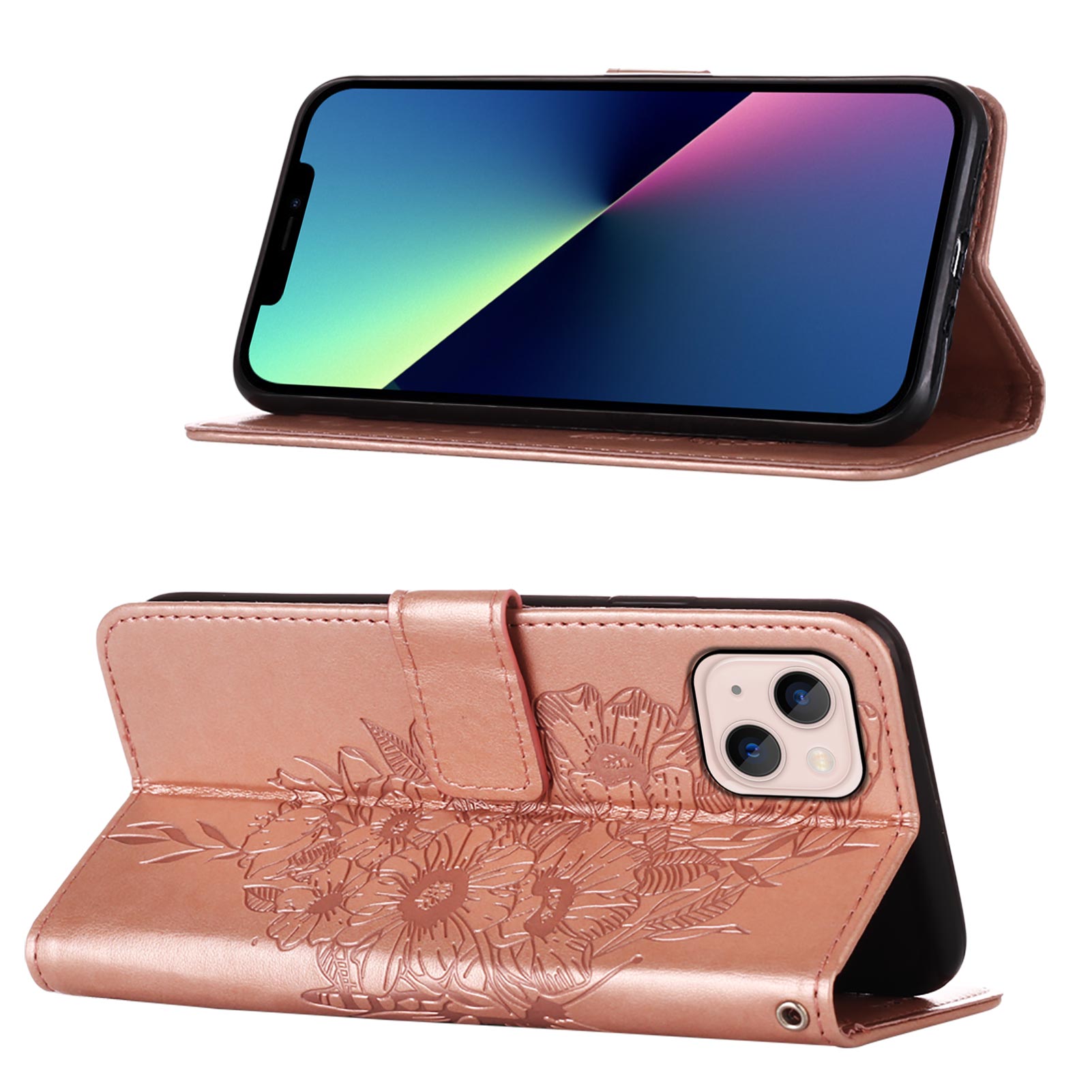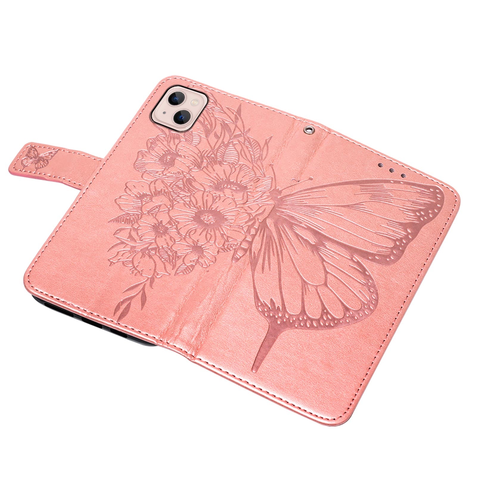 YB Imprinting Series-4 For iPhone 15 PU Leather Stand Phone Case Wallet Butterfly Flower Imprinted Cover with Hand Strap - Rose Gold