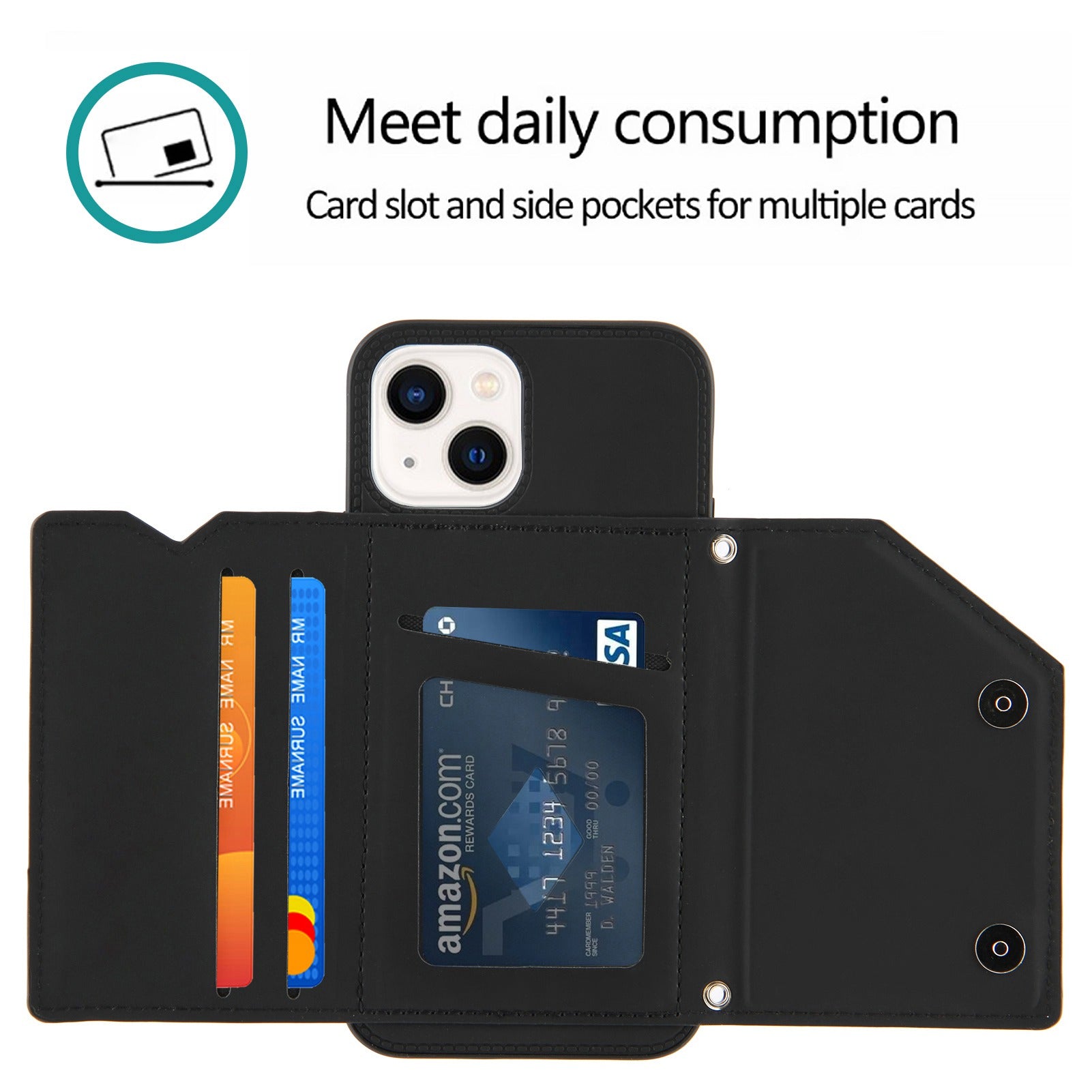 YB Leather Coating Series-2 for iPhone 15 Leather+TPU Cover Kickstand Card Holder Phone Case with Strap - Black