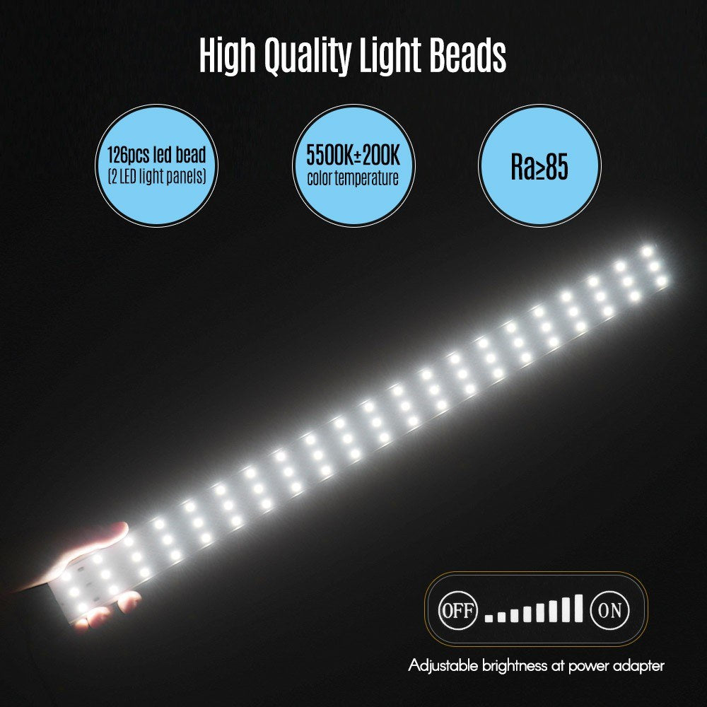 High Quality Light Beads: 2 LED light panels have 126pcs led beads, they can create a super bright and natural lighting effect. 5500K±200K color temperature, it is more realistic to show the color of shooting objects. The shooting tent will help you to take quality photos, you can adjust the brightness by the power adapter