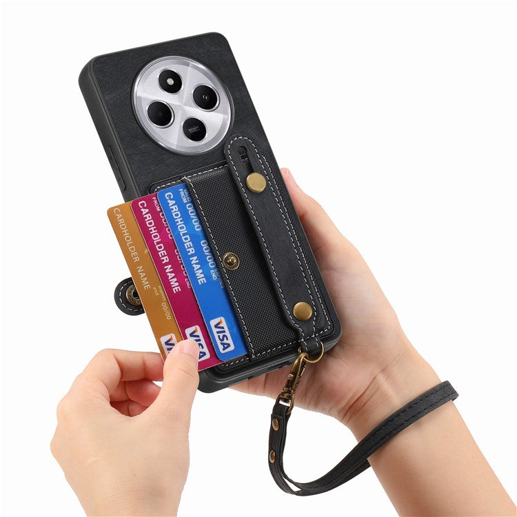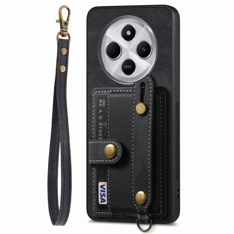 Phone Case For Xiaomi Redmi 14C 4G / 14R 5G / Poco C75 4G Wristband Kickstand PU Leather Retro Back Cover Card Holder - Black