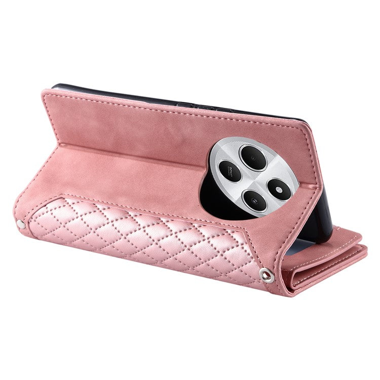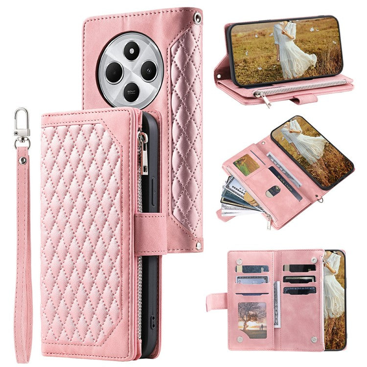 Style 005 For Xiaomi Poco C75 4G / Redmi 14R 5G / 14C 4G Zipper Wallet Case Rhombus Stitching Line PU Leather Phone Cover - Rose Gold