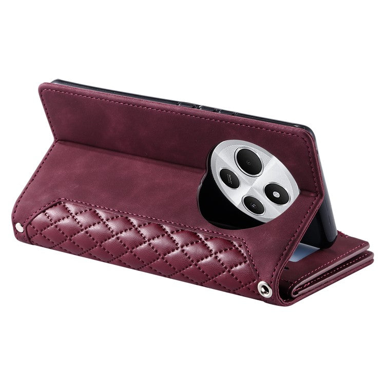 Style 005 For Xiaomi Poco C75 4G / Redmi 14R 5G / 14C 4G Zipper Wallet Case Rhombus Stitching Line PU Leather Phone Cover - Wine Red