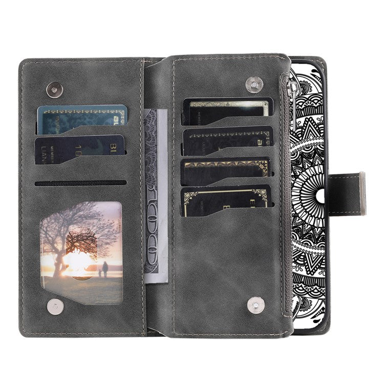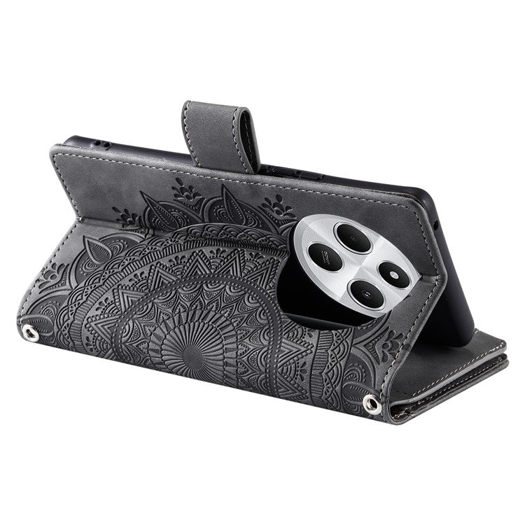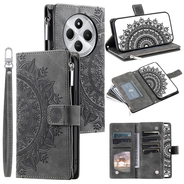 Style 006 For Xiaomi Poco C75 4G / Redmi 14R 5G / 14C 4G Case Mandala Flower Pattern PU Leather Zipper Wallet Phone Cover - Grey