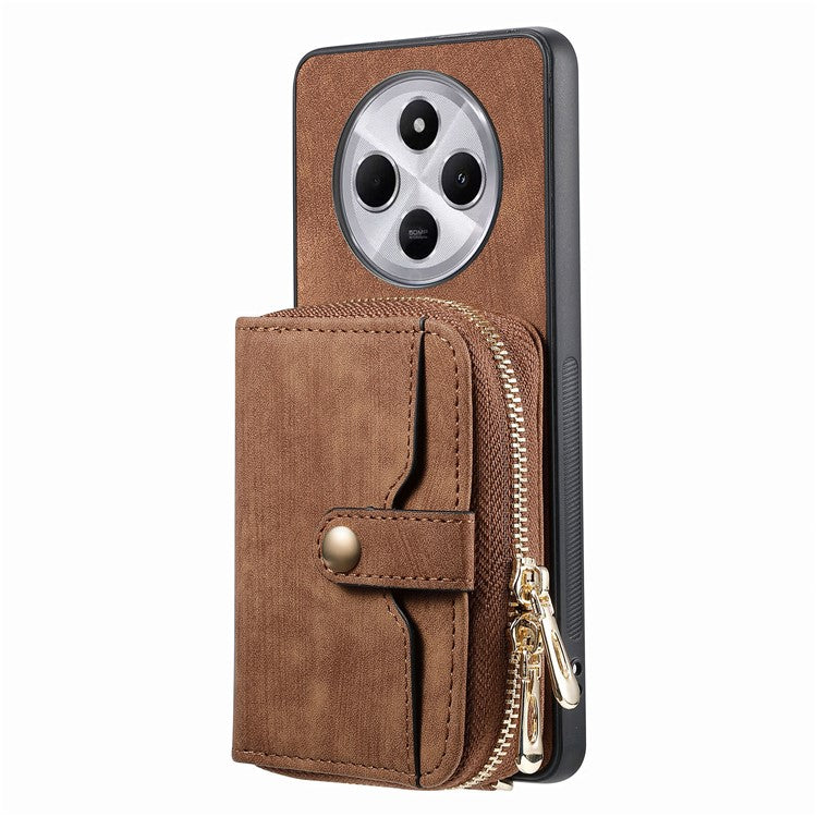 Zipper Wallet Phone Case For Xiaomi Redmi 14C 4G / 14R 5G / Poco C75 4G Leather Kickstand Back Cover with Shoulder Strap - Brown
