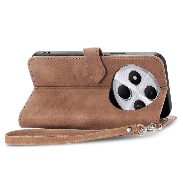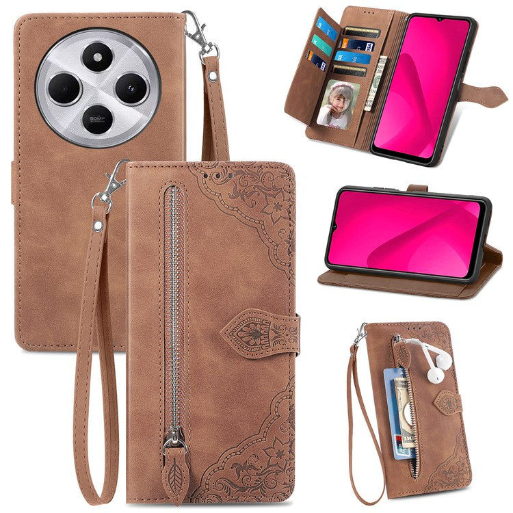 Zipper Wallet Phone Case For Xiaomi Redmi 14C 4G / 14R 5G / Poco C75 4G PU Leather Flower Imprint Phone Cover - Brown