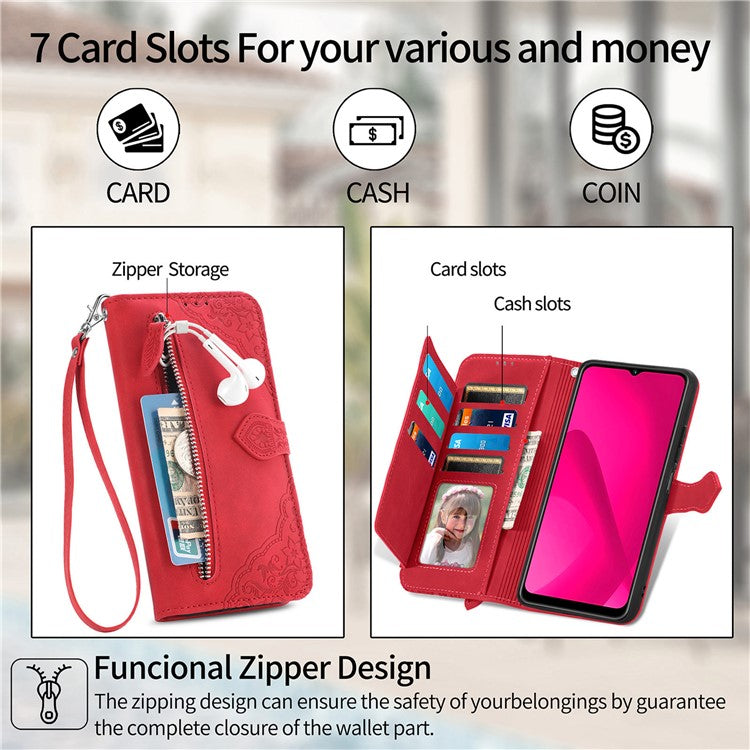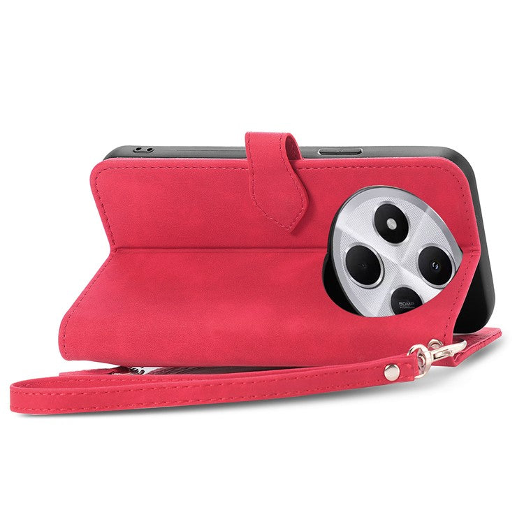 Zipper Wallet Phone Case For Xiaomi Redmi 14C 4G / 14R 5G / Poco C75 4G PU Leather Flower Imprint Phone Cover - Red