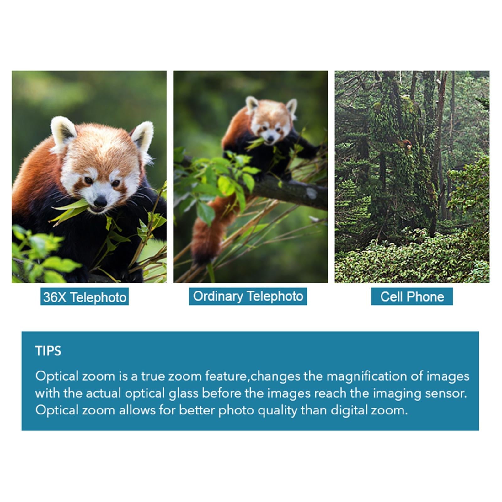 36x telephoto lens bring around 8000M far away subjects closer, make your phone produces close-ups and long-range shots without compromising image quality, can also be used as a standalone telescopic lens to help you view distant objects