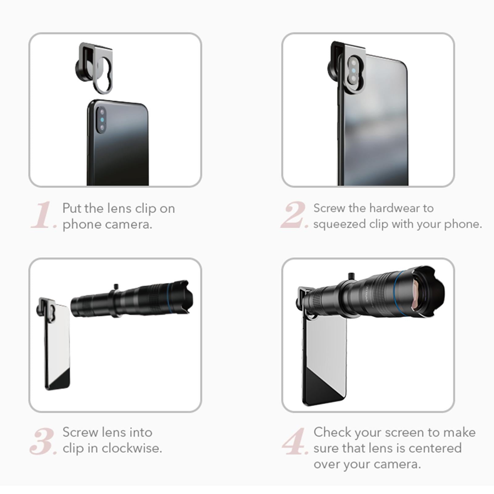 36X Telephoto Lens is equipped with a screw fixing device can adjust and fix the lens clip according to the thickness of the phone, won't leave any scratches on your phone Due to EVA rubber on lens clip