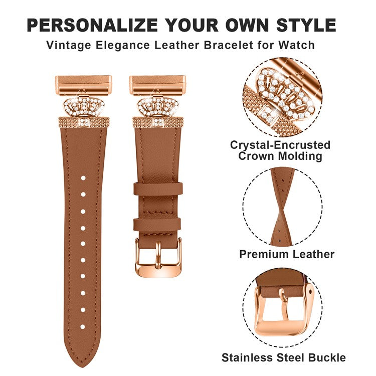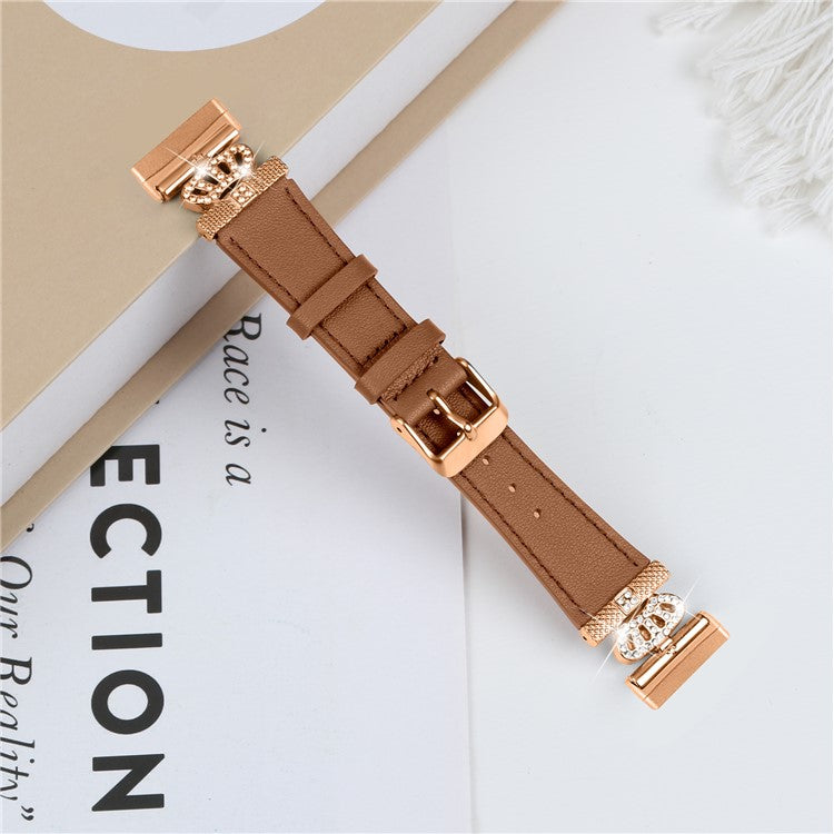 For Fitbit Versa 4 / Sense 2 Smooth Genuine Cow Leather Rhinestone Watch Strap (Rose Gold Buckle) - Brown