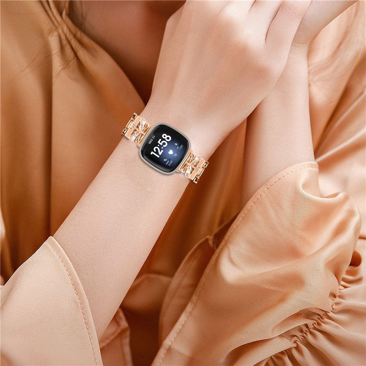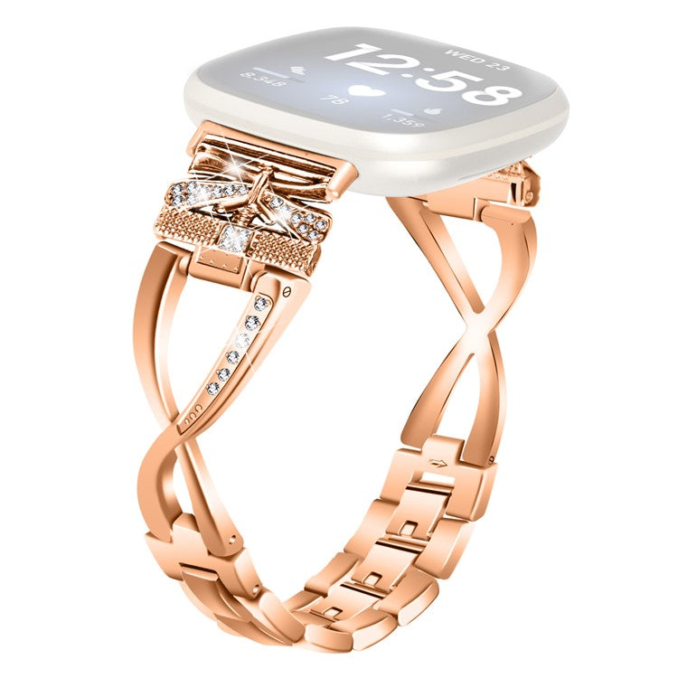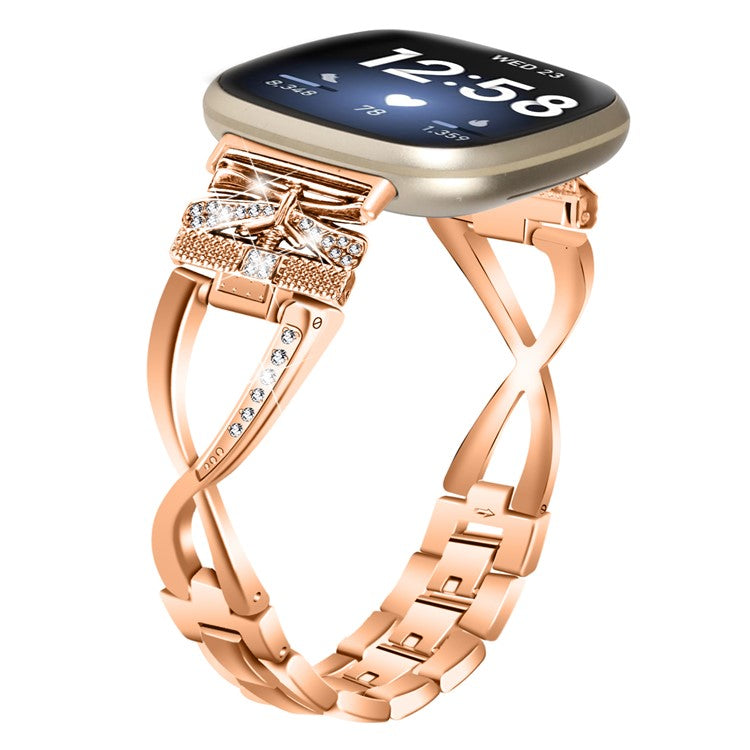 For Fitbit Versa 4 / Sense 2 Zinc Alloy Strap Rhinestones Decor Crown X-shape Smartwatch Band - Rose Gold