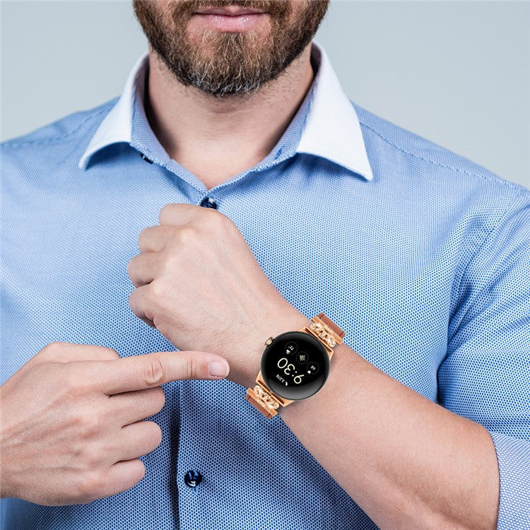 For Google Pixel Watch Rhinestone Genuine Cow Leather Wrist Band Strap (Rose Gold Buckle) - Brown