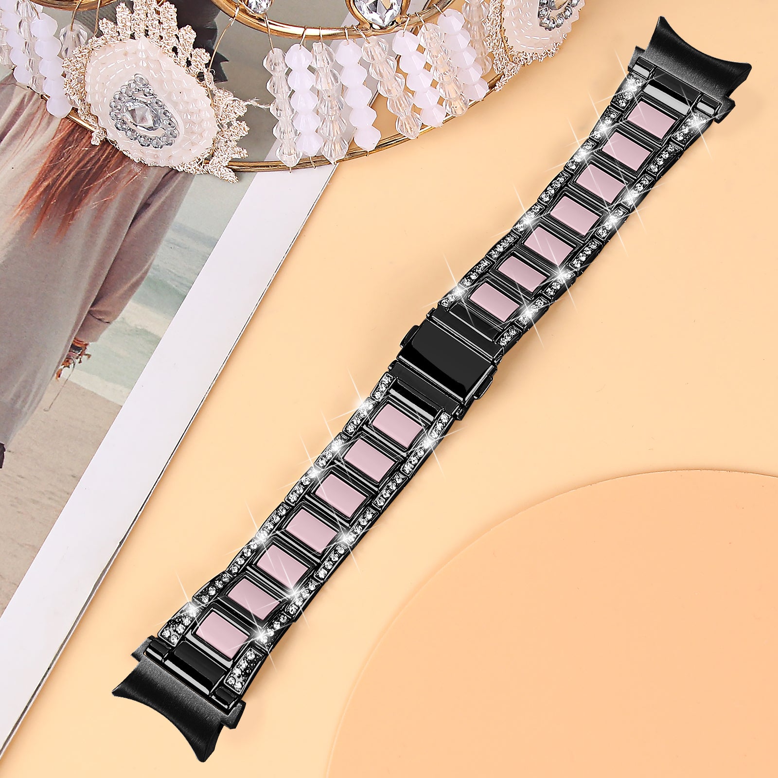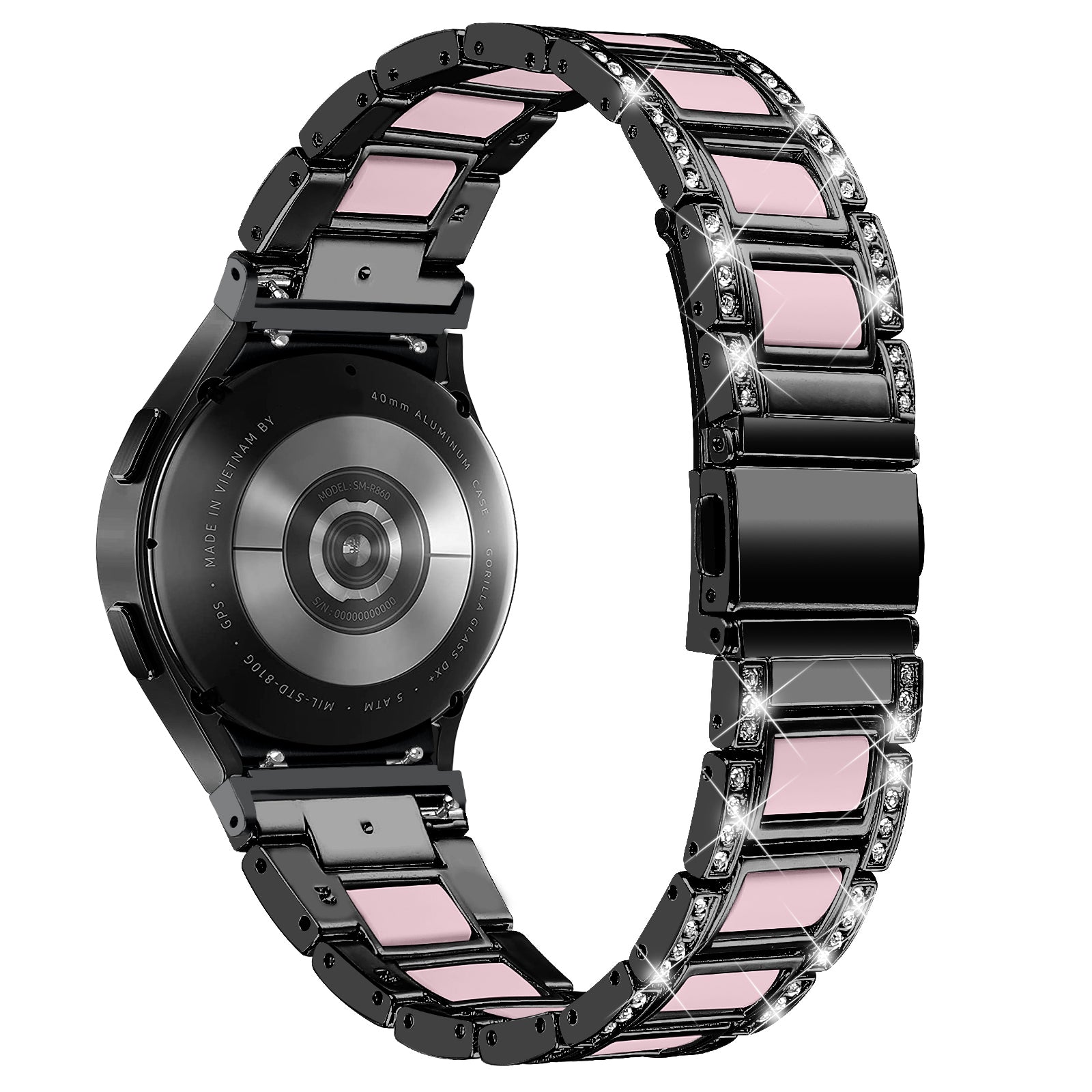 for Samsung Galaxy Watch4 Active 40mm/44mm/Watch4 Classic 42mm/46mm Rhinestone Decor Stainless Steel Resin Watch Band with Watch Strap Adapter - Black/Pink