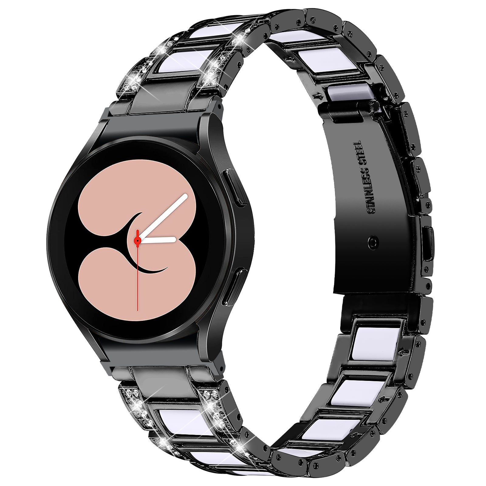 for Samsung Galaxy Watch4 Active 40mm/44mm/Watch4 Classic 42mm/46mm Rhinestone Decor Stainless Steel Resin Watch Band with Watch Strap Adapter - Black/White