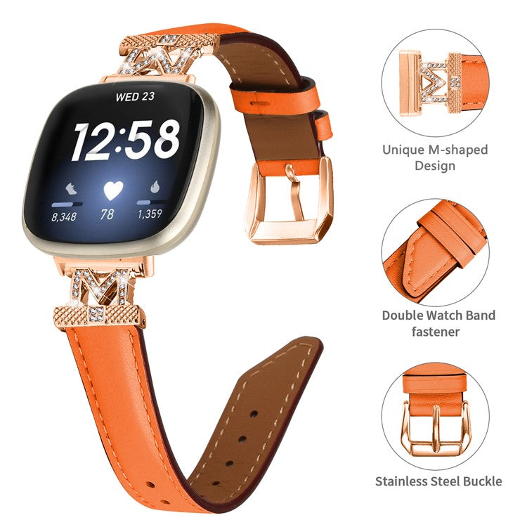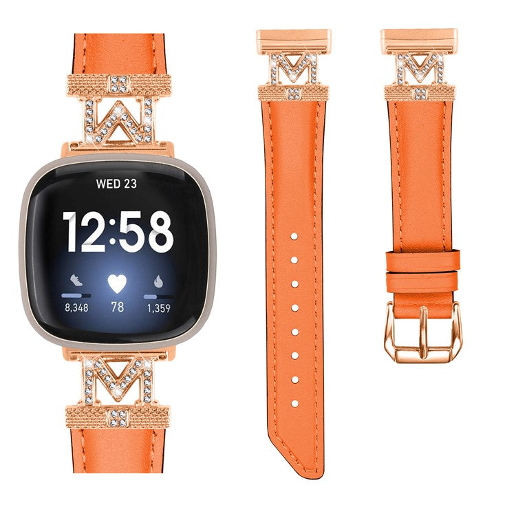 M Shape Rhinestone Watchband for Fitbit Versa 3 / Versa 4 / Sense / Sense 2 Genuine Cowhide Leather Watch Strap with Rose Gold Buckle - Orange