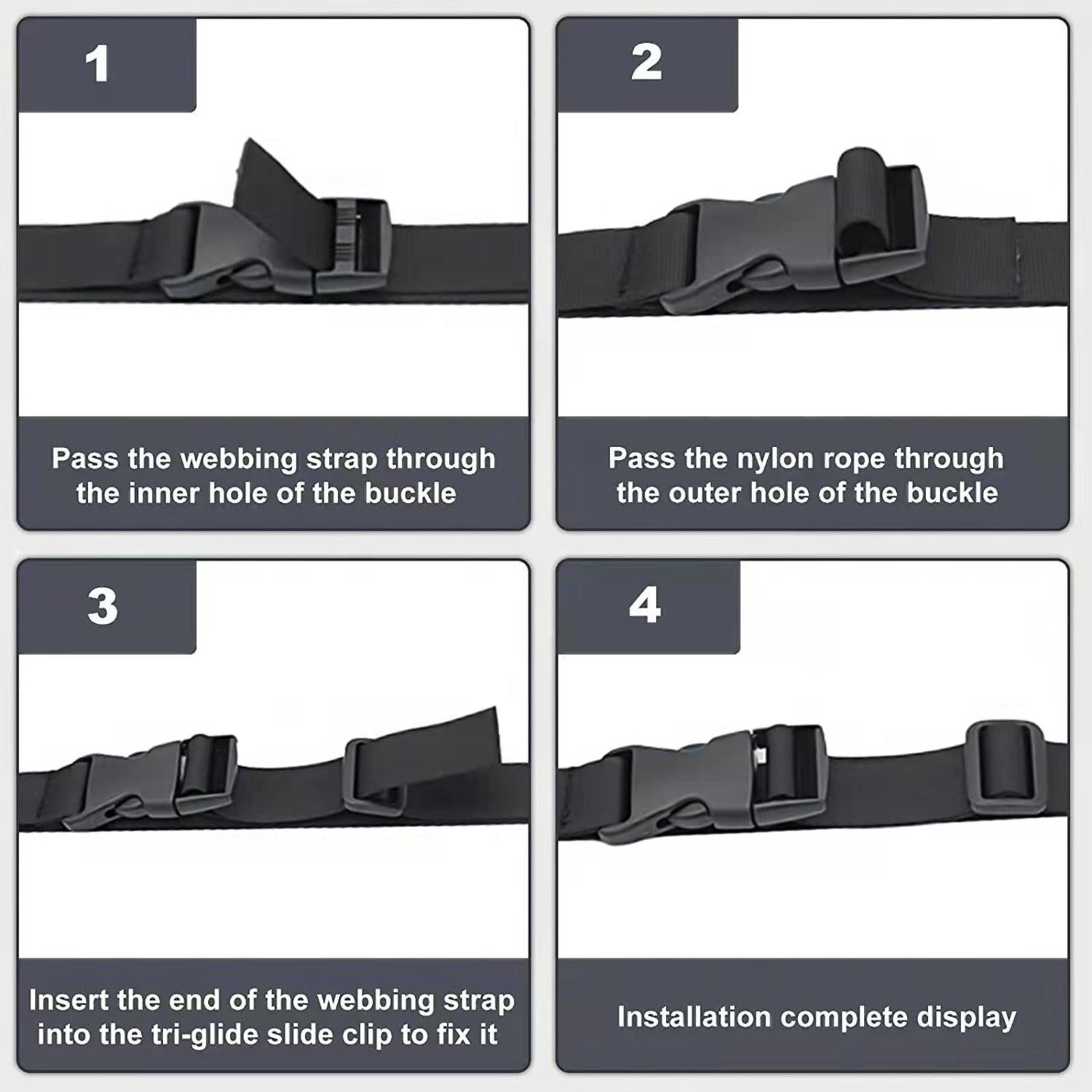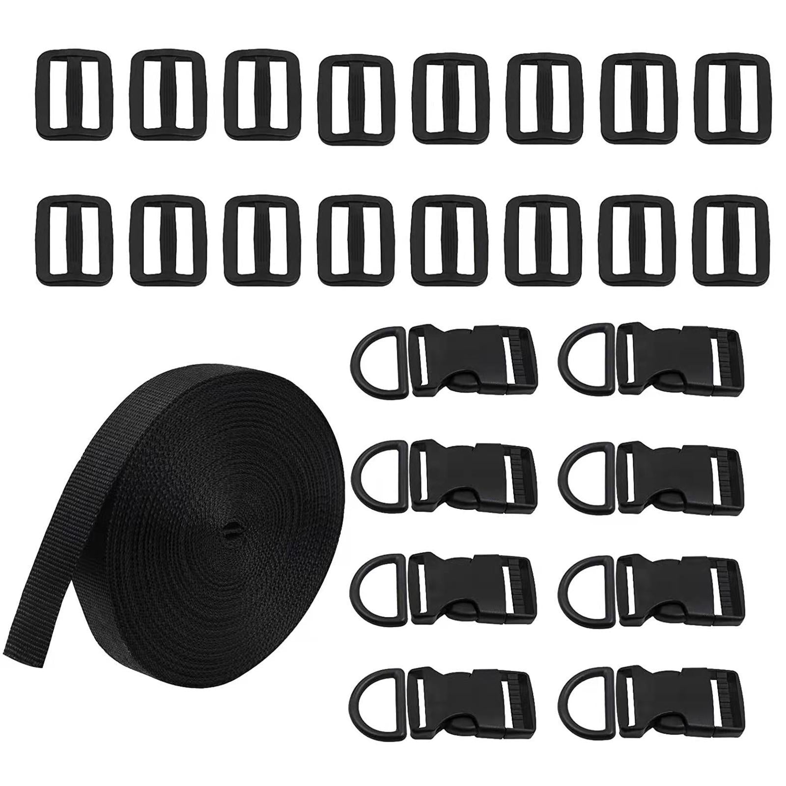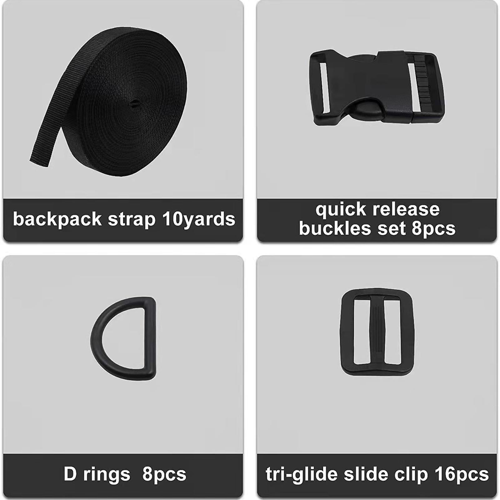 Package includes 8pcs flat side release buckles, 16pcs tri glide slides, 8pcs D rings, and 1pcs 10 yards black nylon webbing strap.