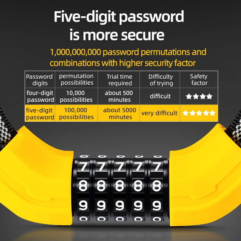 Rockbros 3220001001 Reflective 5 Digit Password Bicycle Lock Thicken Steel Cable Anti-theft Bike Code Lock - Yellow