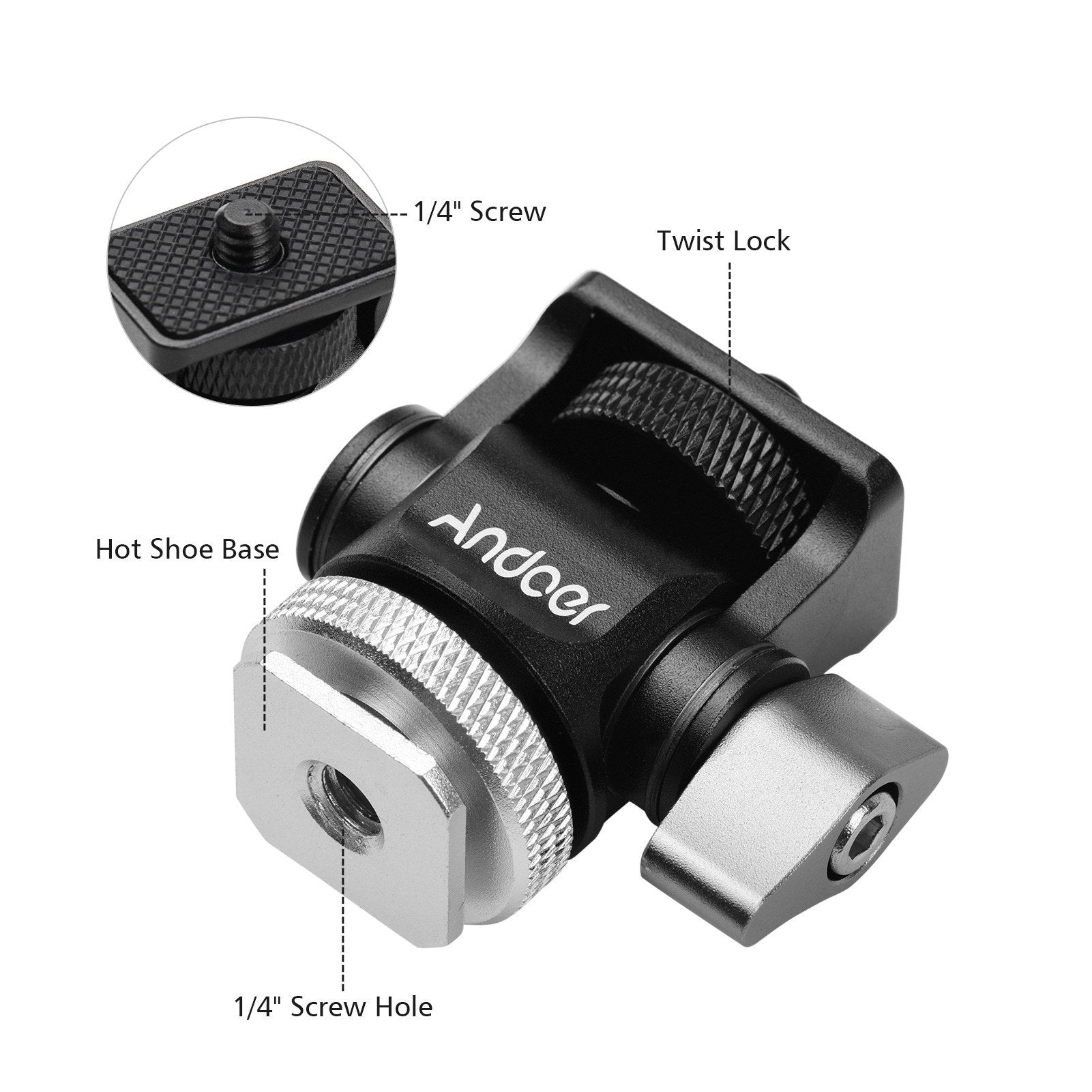 Mini cold shoe mount adapter with standard 1/4 inch screw is suitable for installing field monitor, camera flash, LED fill light, microphone, etc