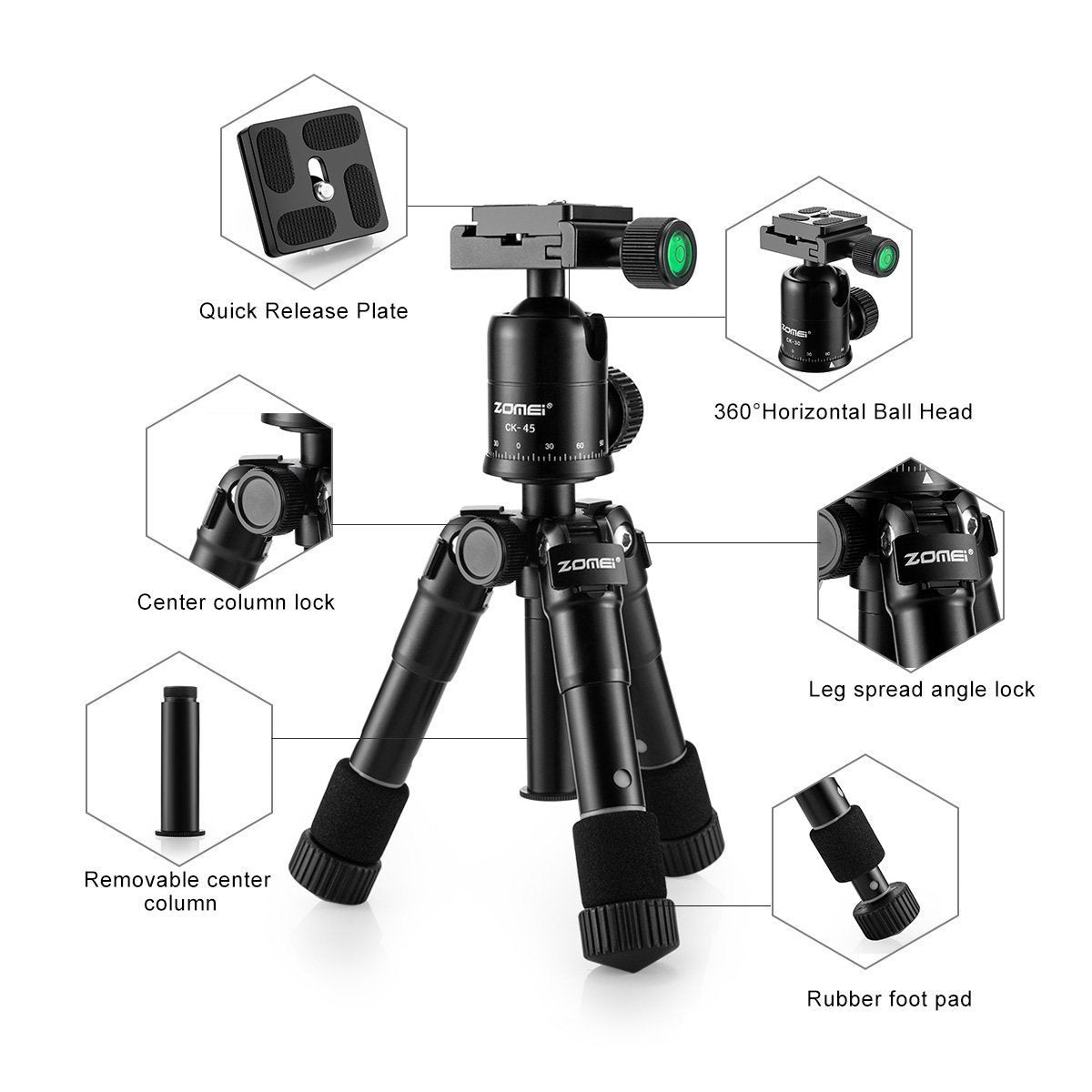 The Zomei CK45 tripod is a lightweight foldable tripod with ball head and quick release plate, ideal for professional DV, DSLR camera, camcorder, smartphones, tablet etc