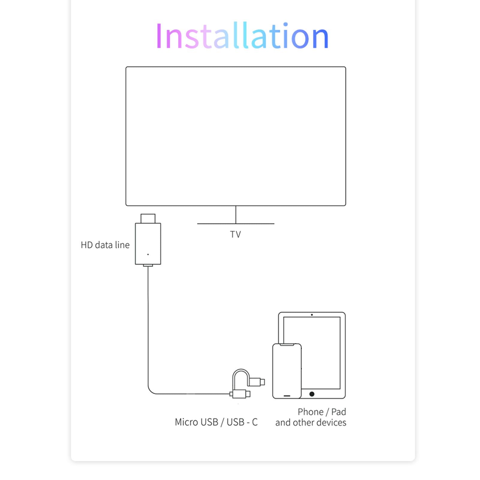 Easy to Use: First plug the HDMI cable into your TV and switch the TV to the HDMI channel. Then plug the USB cable into the power adapter. Finally plug the Type C / Micro USB cable directly into the Android device, wait a few seconds and it will be connected automatically