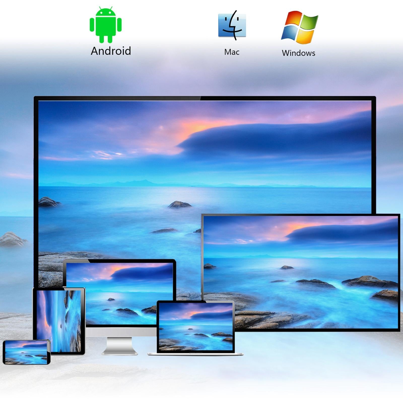 Universal Compatibility: iPhone, iPad, iOS, Android, Windows, Mac OS, PC, tablets, laptop, and Miracast, DLNA, Airplay, Wecast mode.