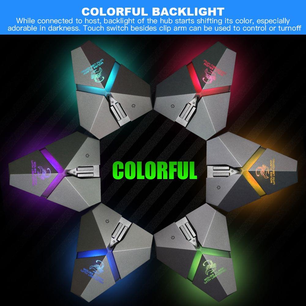 Multiport USB2.0 Data Gaming Hub with TF Card Reader. Complement your computer with added ports and style. Equipped with 3*USB2.0 ports which provides data transmission speed up to 480Mbps. Novel appearance flexible mouse cable holder and cool colorful backlight the USB Hub is a perfect accessory for gaming. Plug and play no additional software or firmware required and no need any additional power supply easy to use.Features:With 3*USB2.0 ports 1*TF card slot for data transmission and Power Charging expanding the port and type of your computer.Built-in colorful backlight and the light color can be changed/turned off through pressing the touching switch.Supports BC 1.2 Fast Charging and it supports over current protection which can be charged for smartphones/tablets through the USB port.High performance USB HUB which can connect 2TB mobile HDD directly without any External Power-supply.It also supports connecting External Power-supply via the micro USB interface.Easy to connect to most peripheral devices such as mouse keyboard USB flash drives smartphone etc.Comes with detachable mouse clamp helping keep cables in order and keep your desktop away from confusion when playing games.Simple to use plug and play no driver needed suitable for all USB devices.Specifications:Material: Aluminum alloy+ABS+Silicone+Zine-alloyColor: GreyInterface: 3 * USB2.0 PortsTransmission Speed: up to 480MbpsPower Voltage: +5V DC10%Cable Length: approx. 1.2M USB CableItem Size: 116 * 103 * 21mm / 4.57 * 4.06 * 0.83inPackage Size: 170 * 135 * 35mm / 6.69 * 5.31 * 1.38inPackage Weight: 300g / 10.58ouncePackage List:1 * USB-HUB1 * Mouse Bungee1 * USB Cable