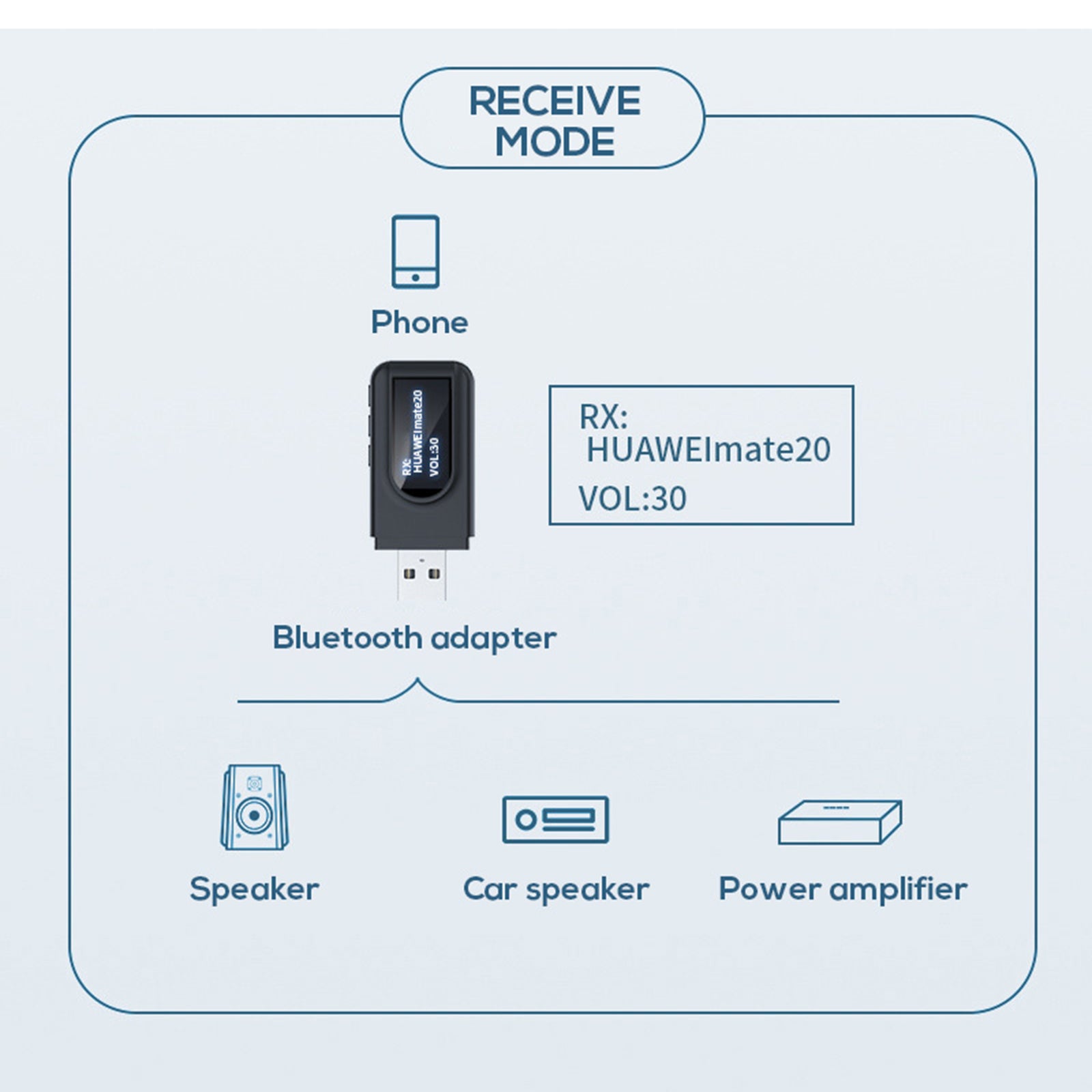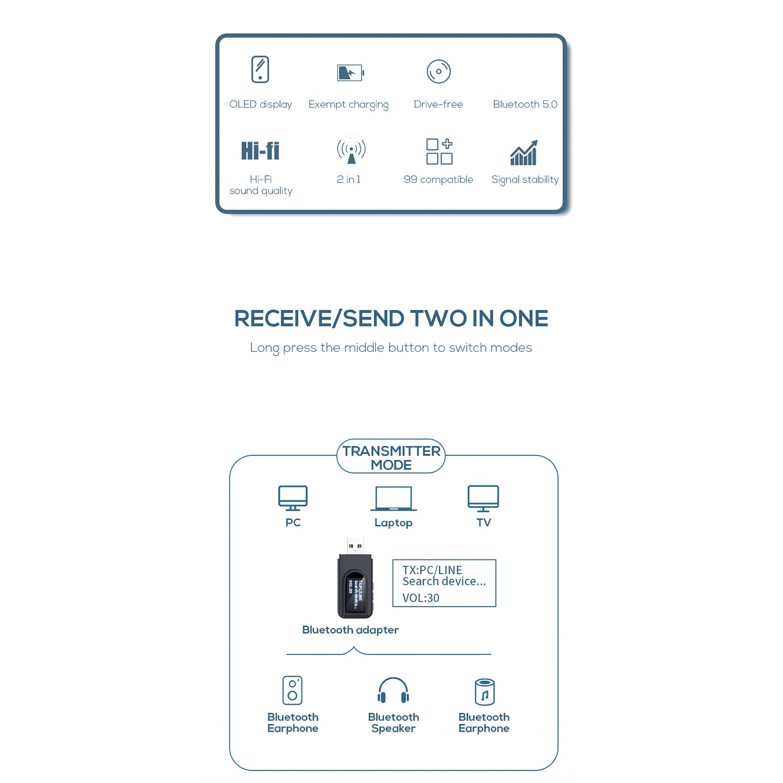 - Bluetooth 5.0 receiver/transmitter 2-in-1 adapter