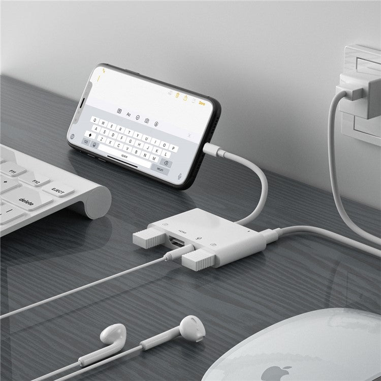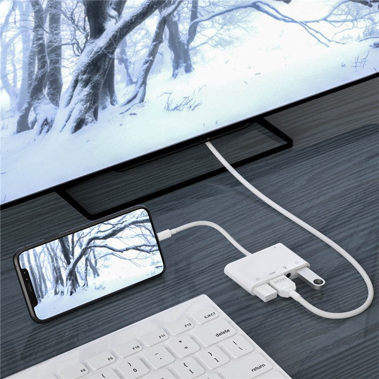 5-in-1 Lightning to Microphone Aux Jack HDMI Audio Adapter 4K TV Dual USB Hub OTG Adapter for iPhone 12/11 Pro/11/XS/X/8/7/iPad