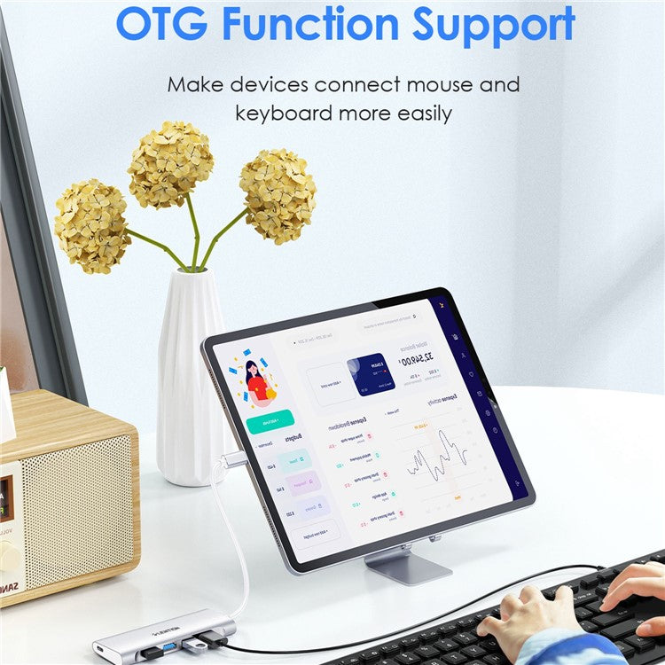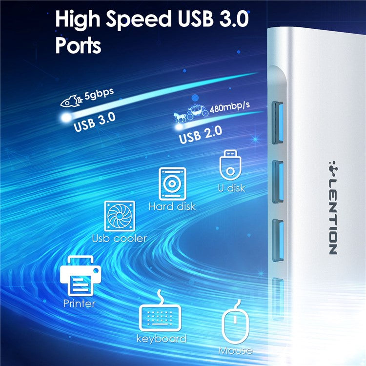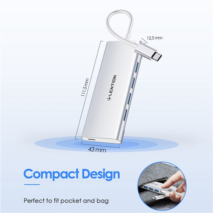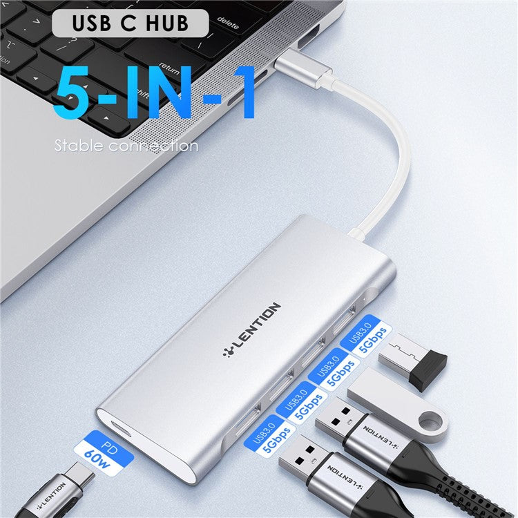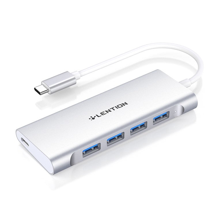 LENTION C31 USB-C to 4 USB-A 3.0 + 1 PD Port Adapter Laptop Aluminum Alloy USB Hub - Silver