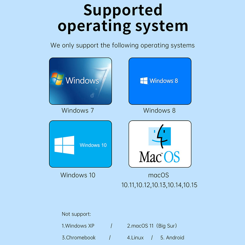 - Compatible with Windows7/Windows8/Windows10Windows11/MAC OS, not compatible with Linux and Vista
