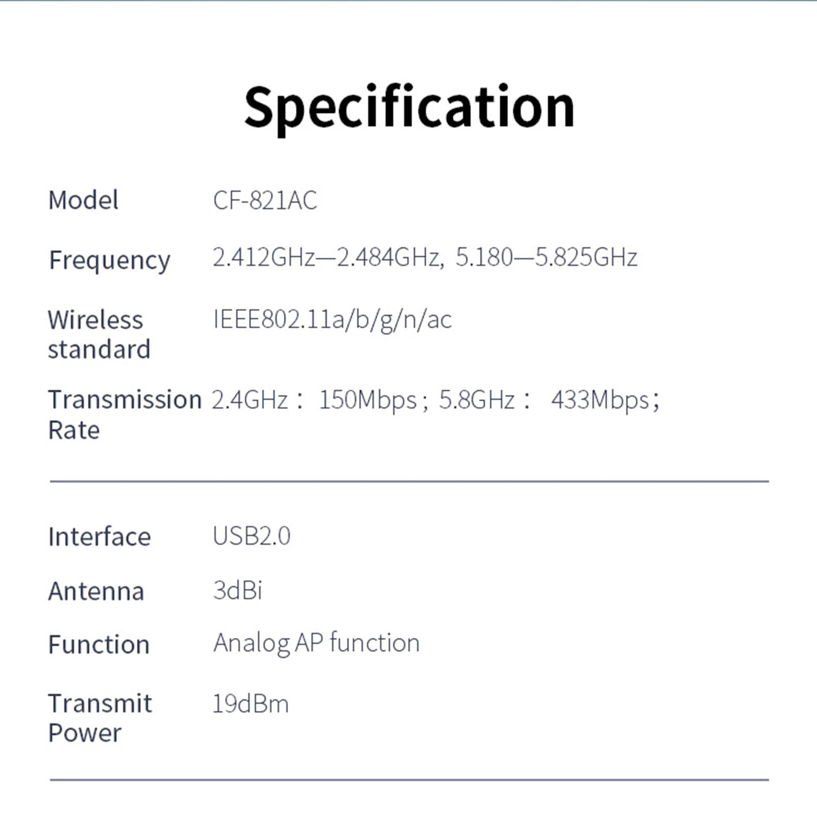 Standard Transmission Rate: 2.4GHz: 150Mbps; 5.8GHz: 433bps