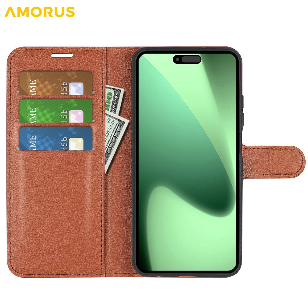 AMORUS For iPhone 17 Pro Max Wallet Case Litchi Texture Shockproof Leather Flip Stand Phone Cover - Brown