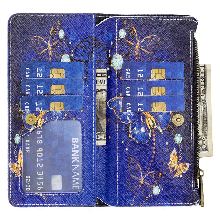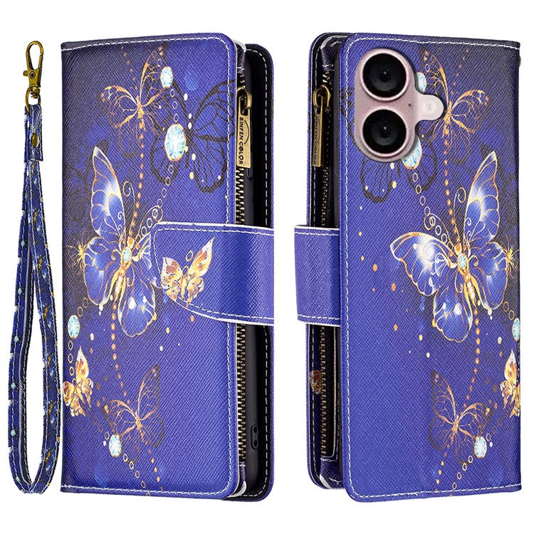BF03 For iPhone 16 Case Pattern Printing Zipper Leather Phone Stand Cover - Purple Butterflies