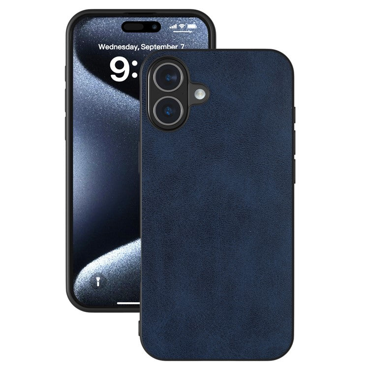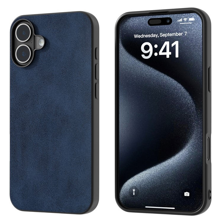 For iPhone 16 Case Cowhide Texture PU+TPU+PC Protective Phone Cover - Blue