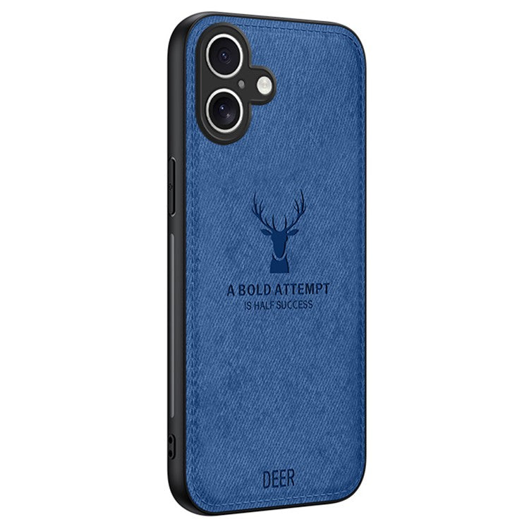 For iPhone 16 Plus Case Deer Pattern Cloth Texture PU Leather Hybrid Phone Cover - Blue
