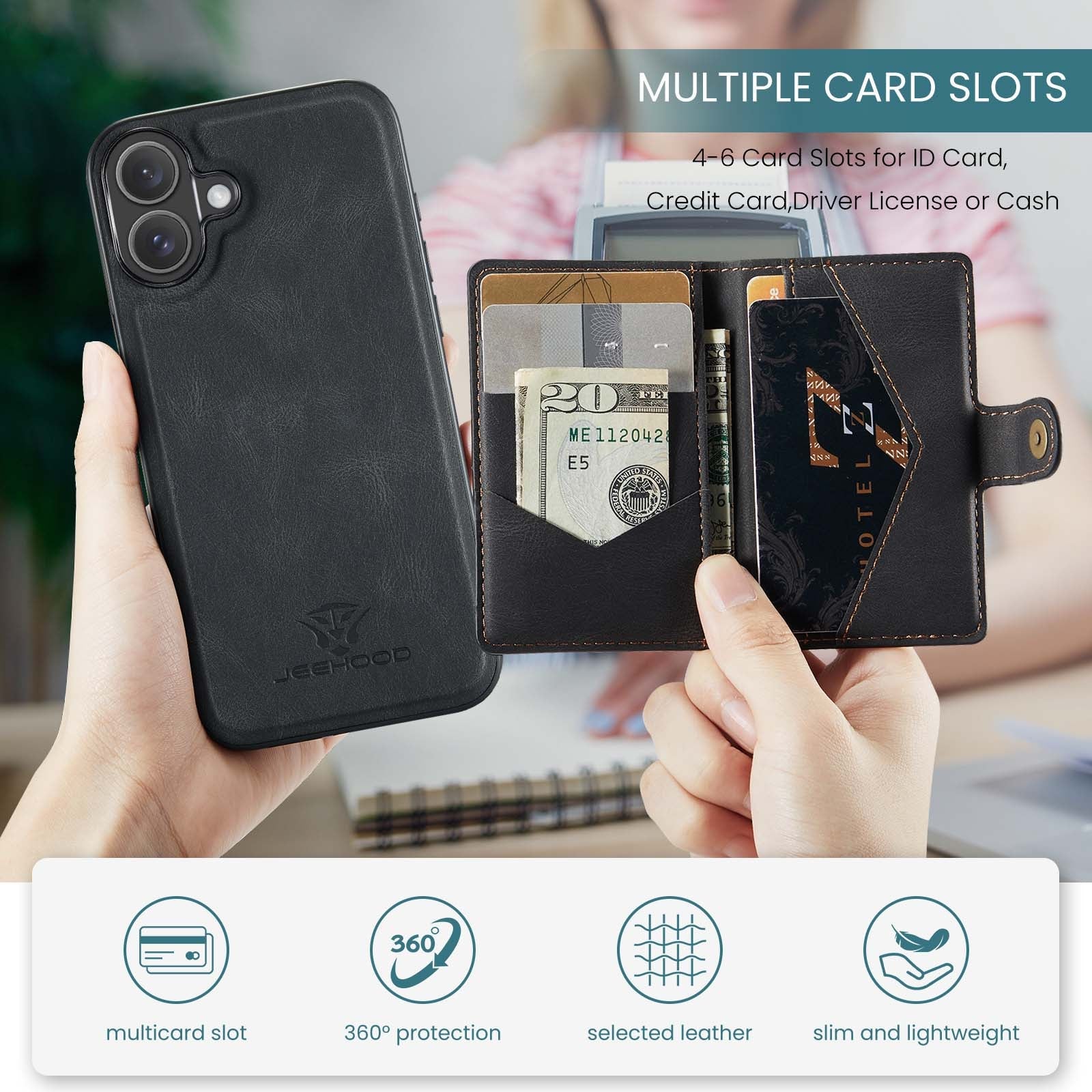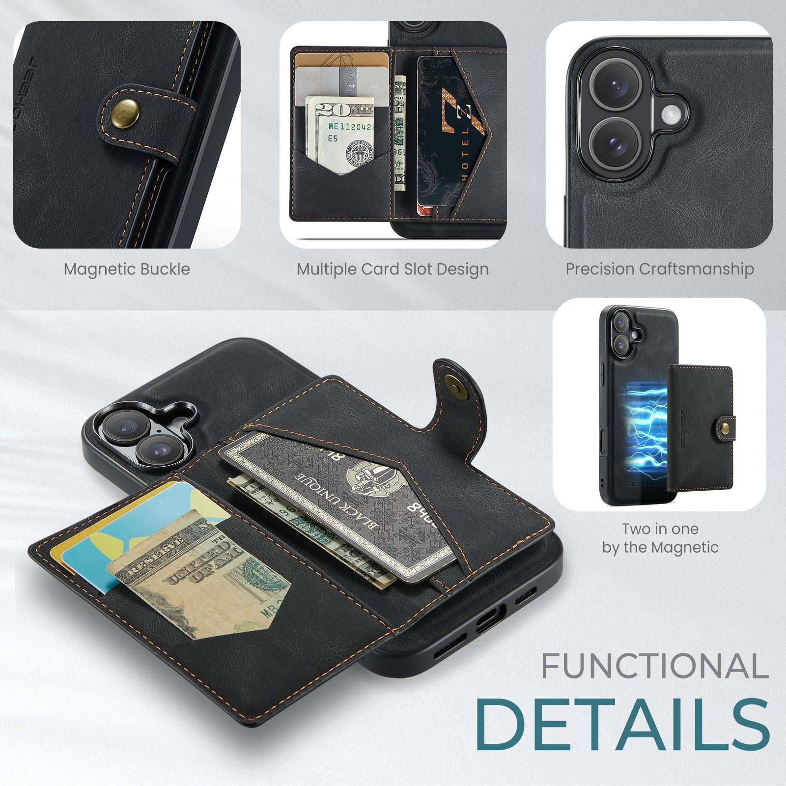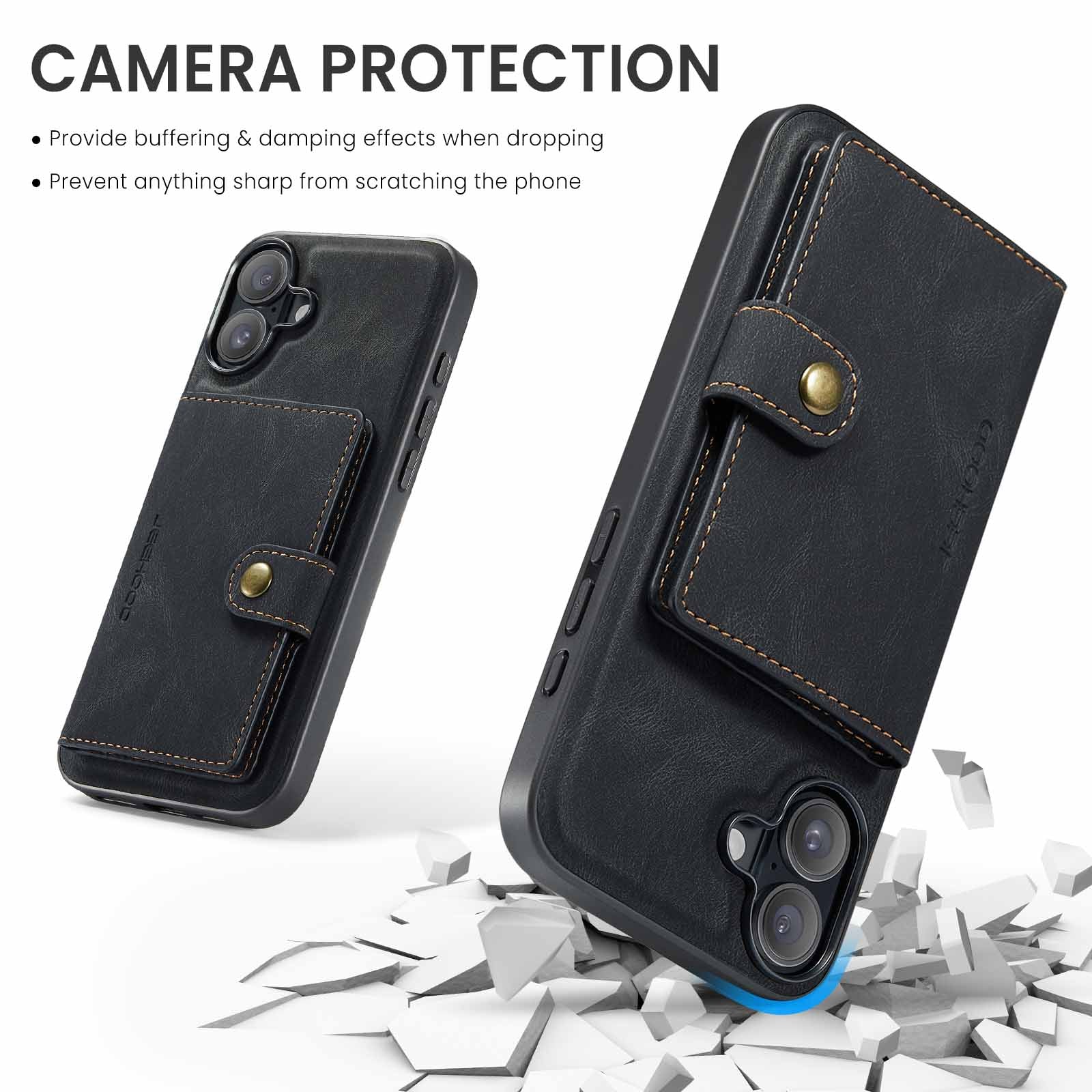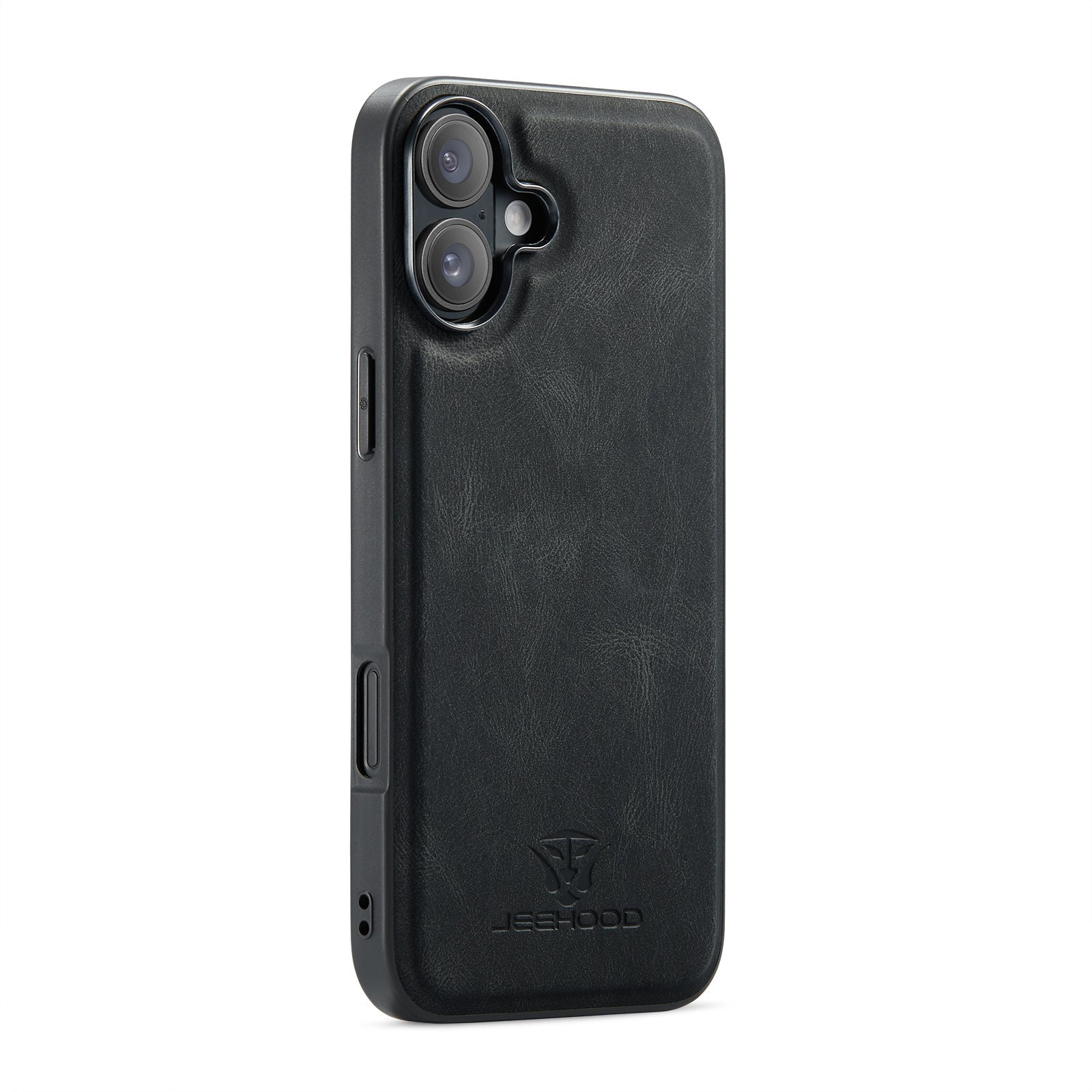 For iPhone 16 Plus Case JEEHOOD J01 Retro Leather + TPU Phone Cover Detachable Magnetic Card Holder - Black