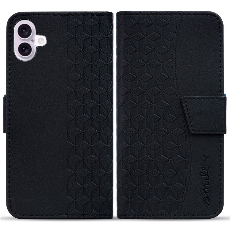For iPhone 16 Plus Case PU Leather Phone Cover Wrist Strap Rhombus Pattern - Black