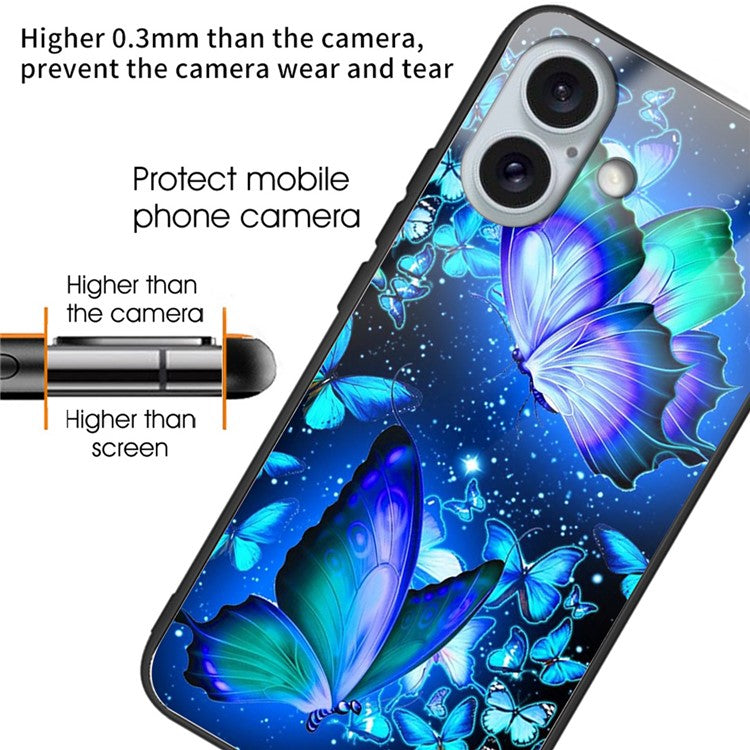For iPhone 16 Plus Case Tempered Glass Back TPU Phone Shell Pattern Printed - Blue Butterflies