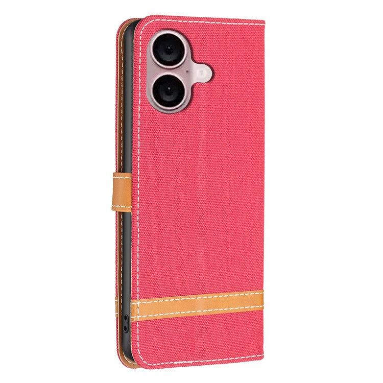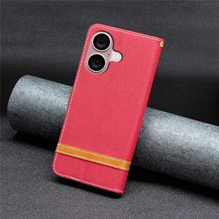 For iPhone 16 Plus Cell Phone Case Jeans Cloth Texture Leather Wallet Protective Cover - Red