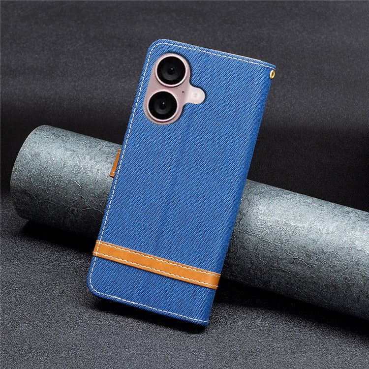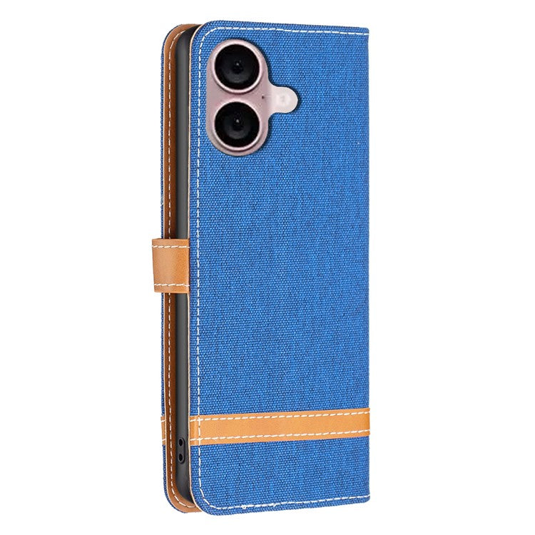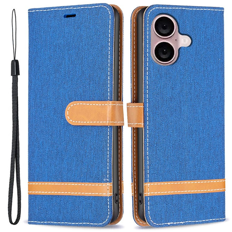 For iPhone 16 Plus Cell Phone Case Jeans Cloth Texture Leather Wallet Protective Cover - Sapphire