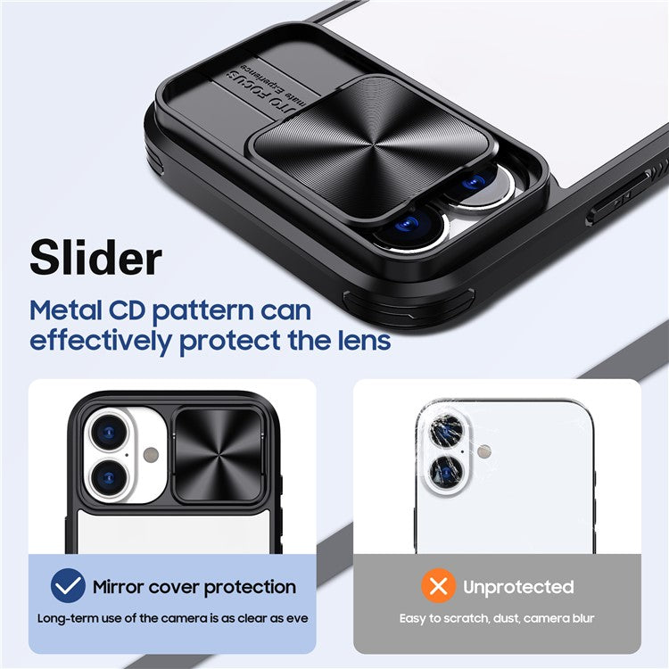 For iPhone 16 Plus Clear Case CD-Veins Camera Lens Sliding Lid TPU+PC Phone Cover - Black