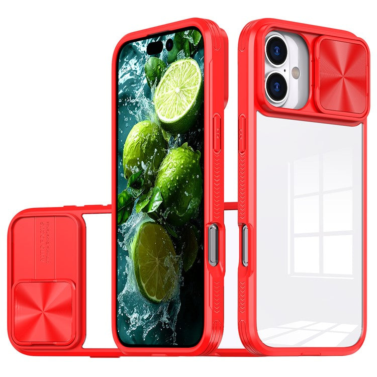 For iPhone 16 Plus Clear Case CD-Veins Camera Lens Sliding Lid TPU+PC Phone Cover - Red