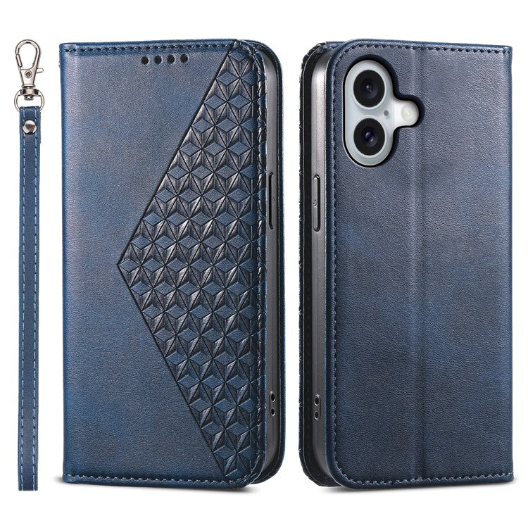 For iPhone 16 Wallet Case Calf Texture PU Leather Phone Cover with Strap - Blue