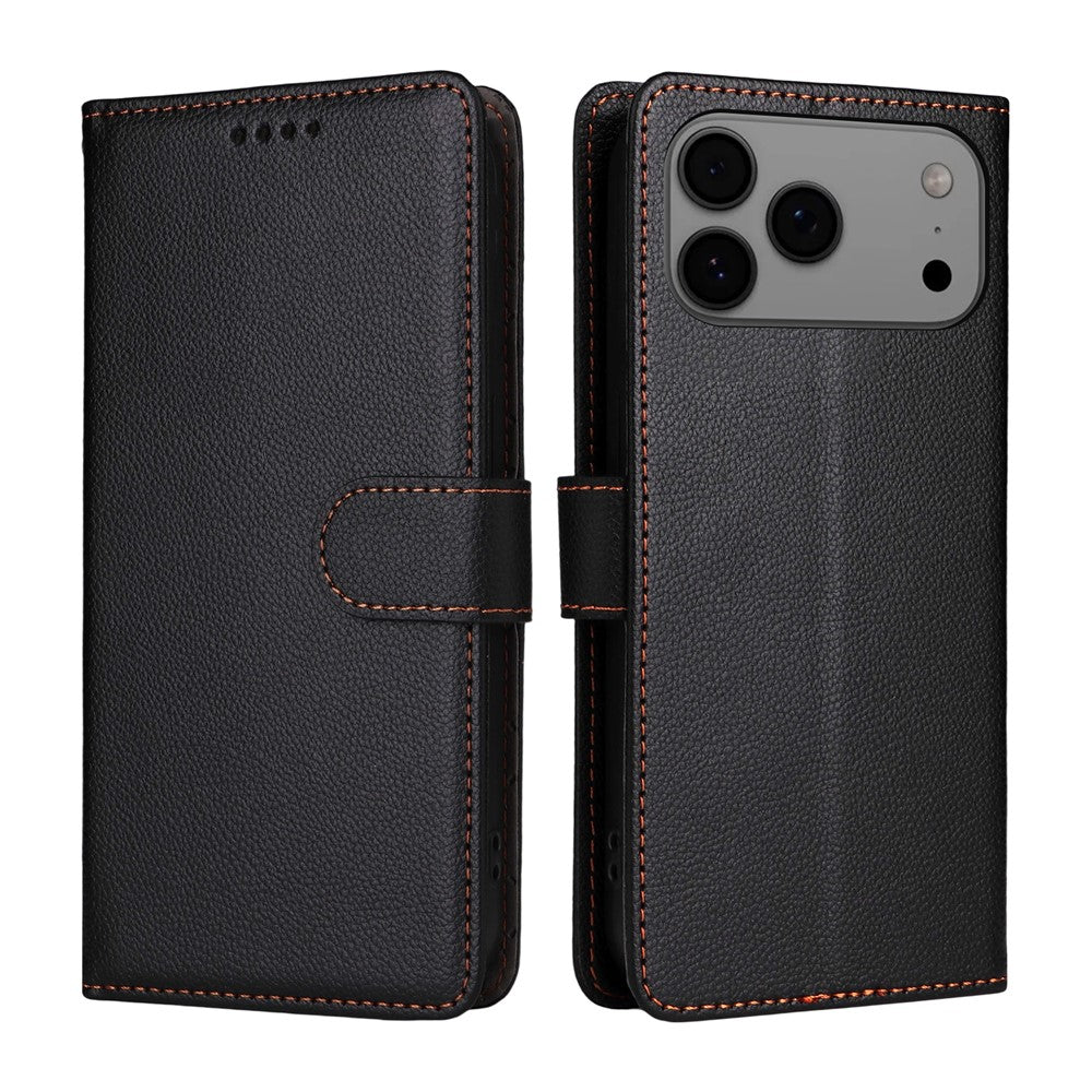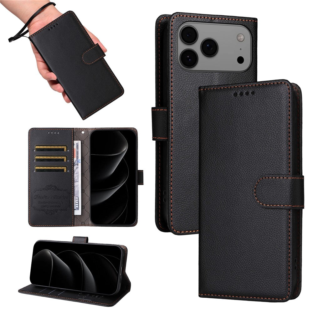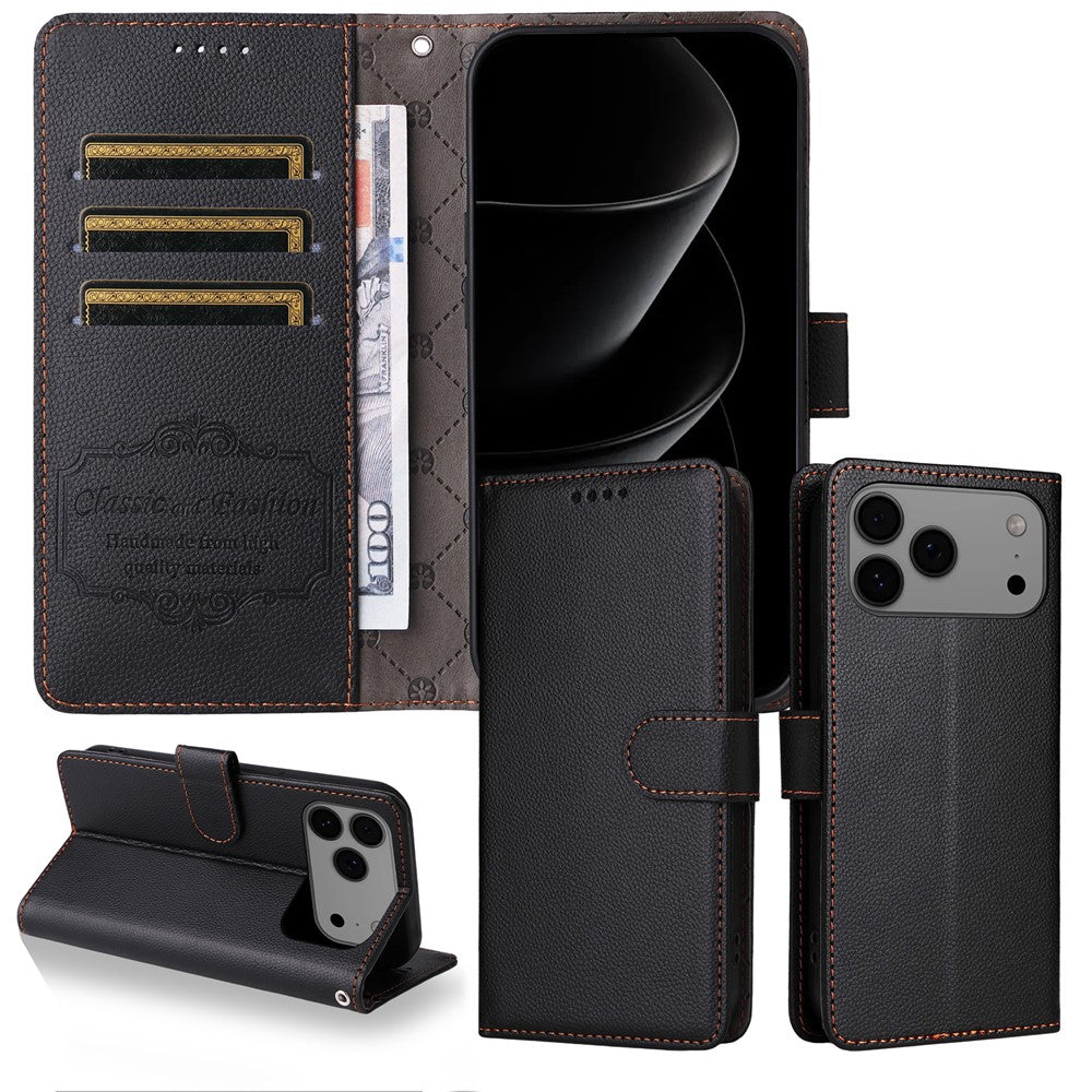 For iPhone 17 Pro Max Case RFID Blocking 3 Card Slots PU Leather Phone Cover with Wrist Strap - Black