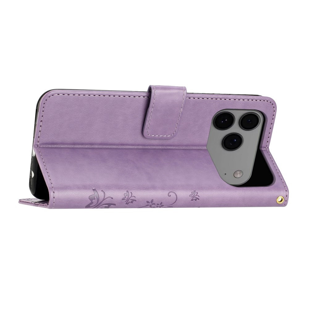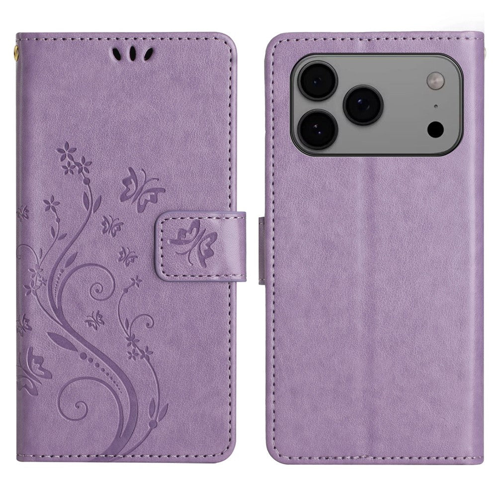 For iPhone 17 Pro Max Leather Wallet Case Butterfly Flower Imprinted Phone Cover with Strap - Light Purple