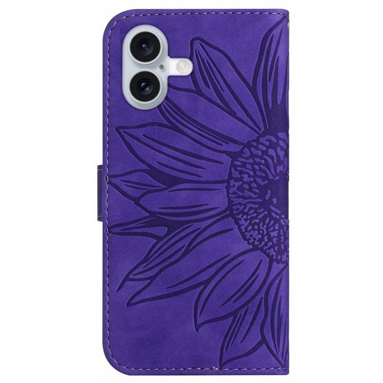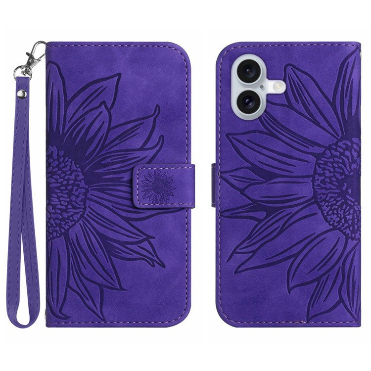 HT04 For iPhone 16 Plus Wallet Case Sunflower Leather Flip Phone Cover with Hand Strap - Dark Purple