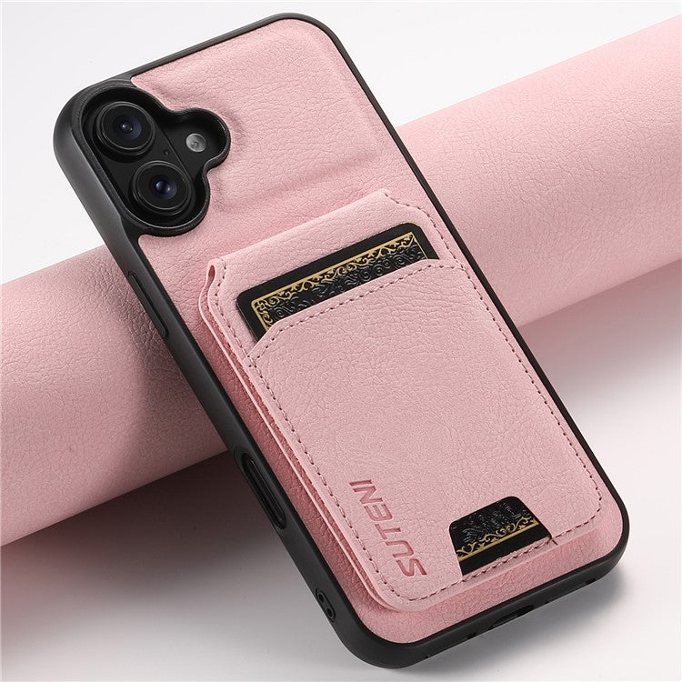 SUTENI H02 For iPhone 16 Case Card Slots Kickstand Litchi Texture Leather+TPU Cover - Pink