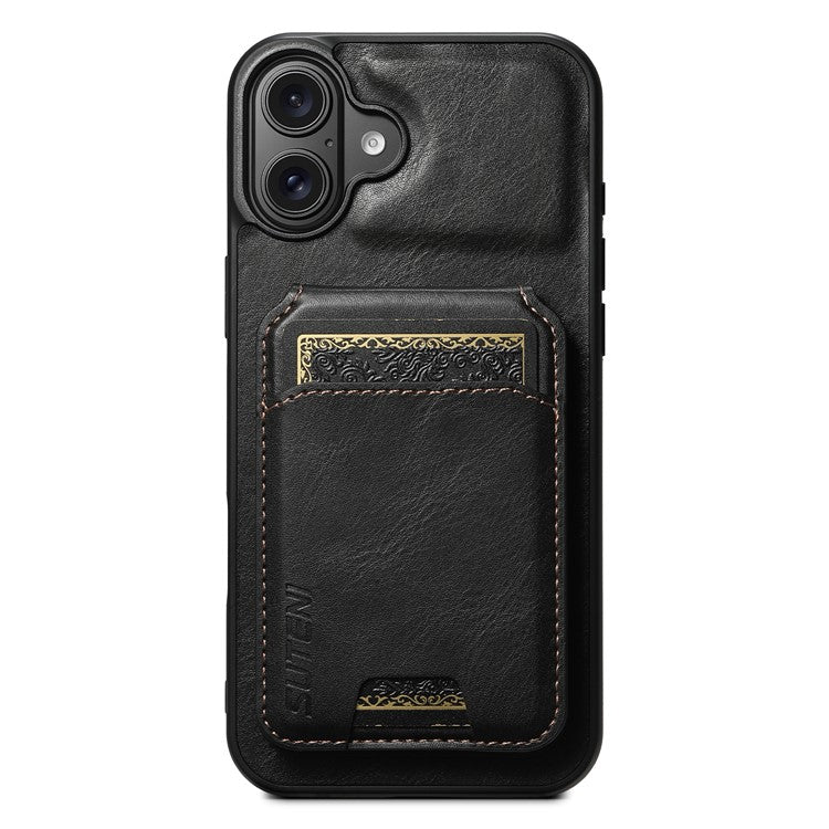 SUTENI H02 For iPhone 16 Plus Case Waxy Texture Leather+TPU Card Slots Kickstand Phone Cover - Black